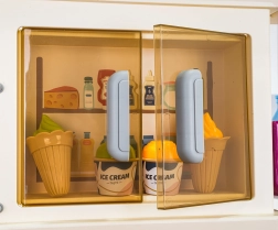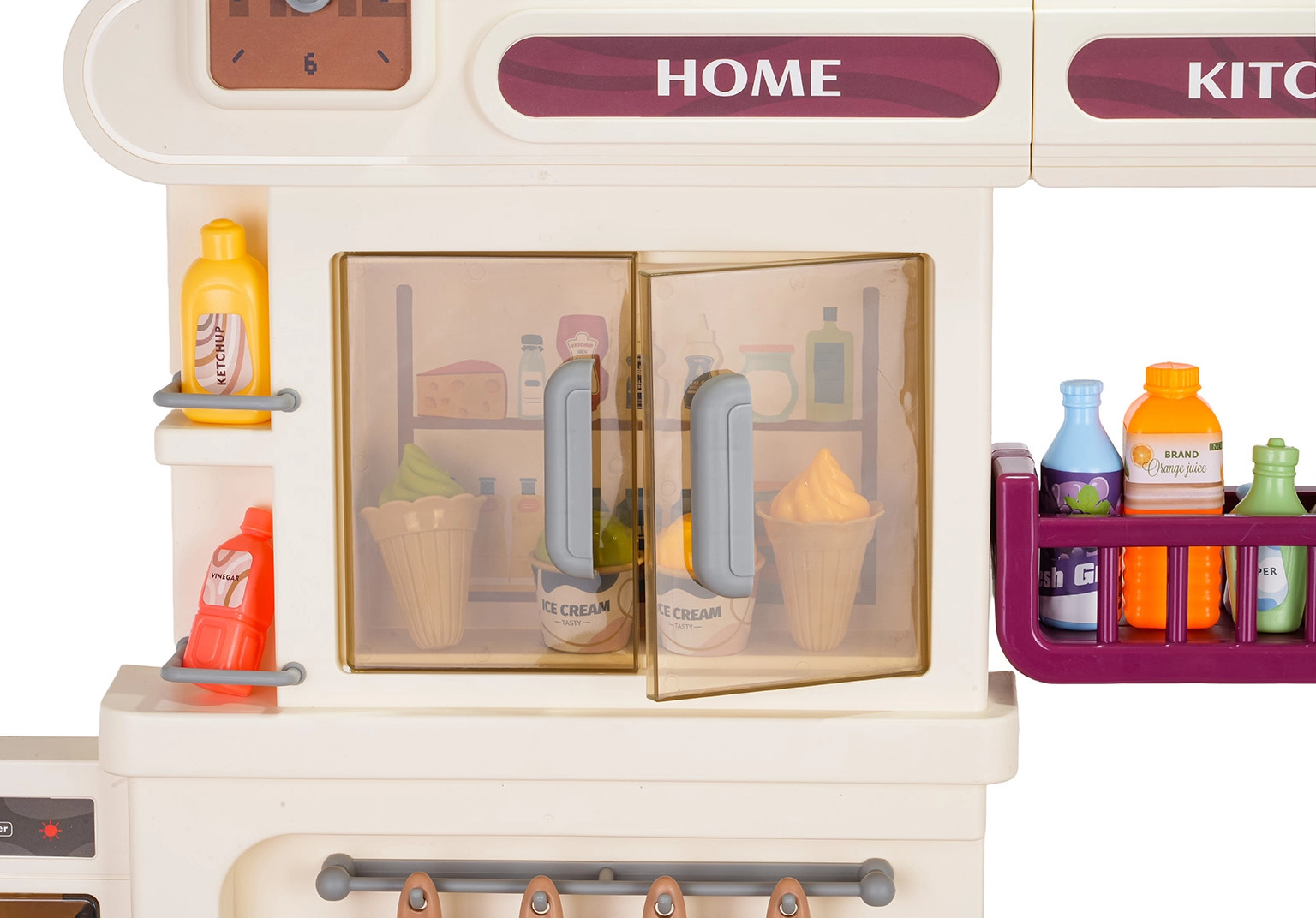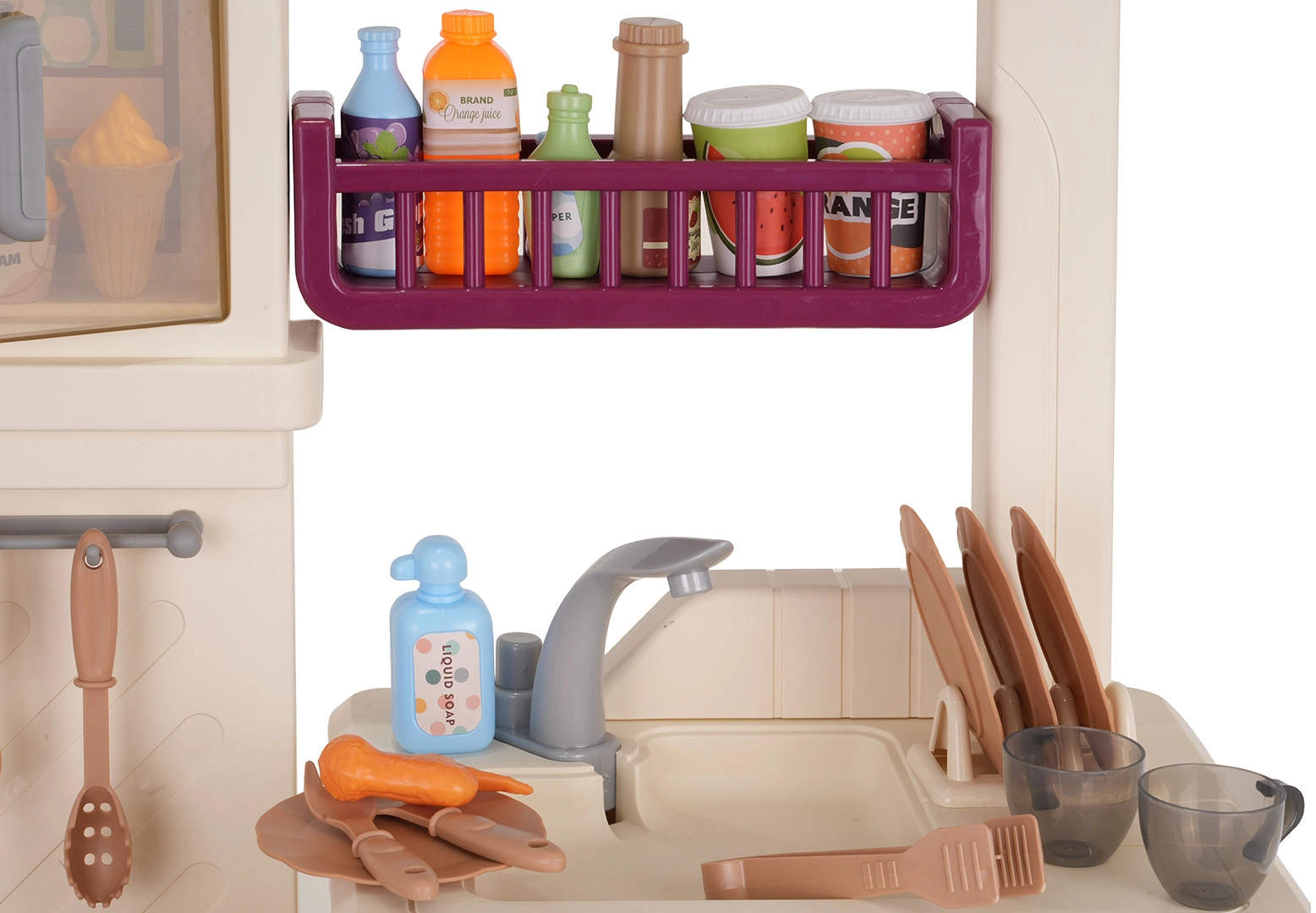 Del grifo fluye agua de verdad, mientras que la nevera, el horno, los armarios y las estanterías guardan todos los accesorios y mantienen el área de juego ordenada.