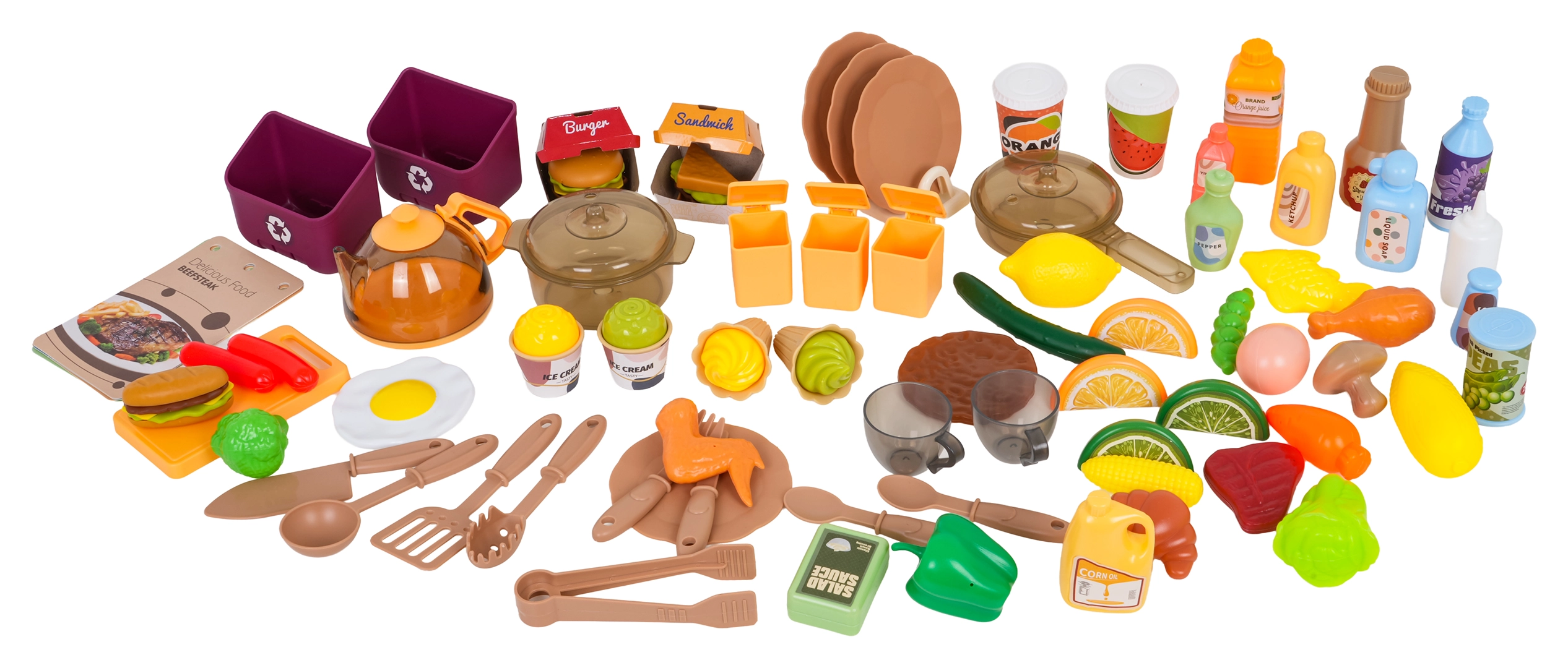 Ollas, sartén, jarrita, vajilla, cubiertos, especieros, alimentos, cartas de menú e incluso cubos de basura: todo lo que los pequeños chefs necesitan.