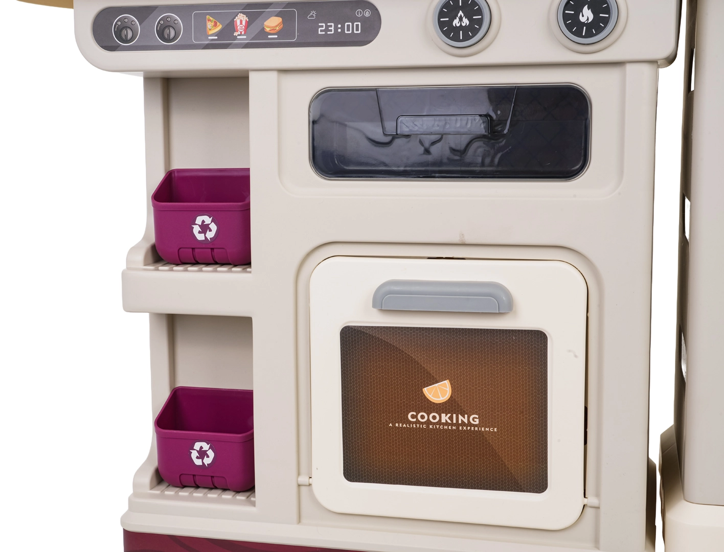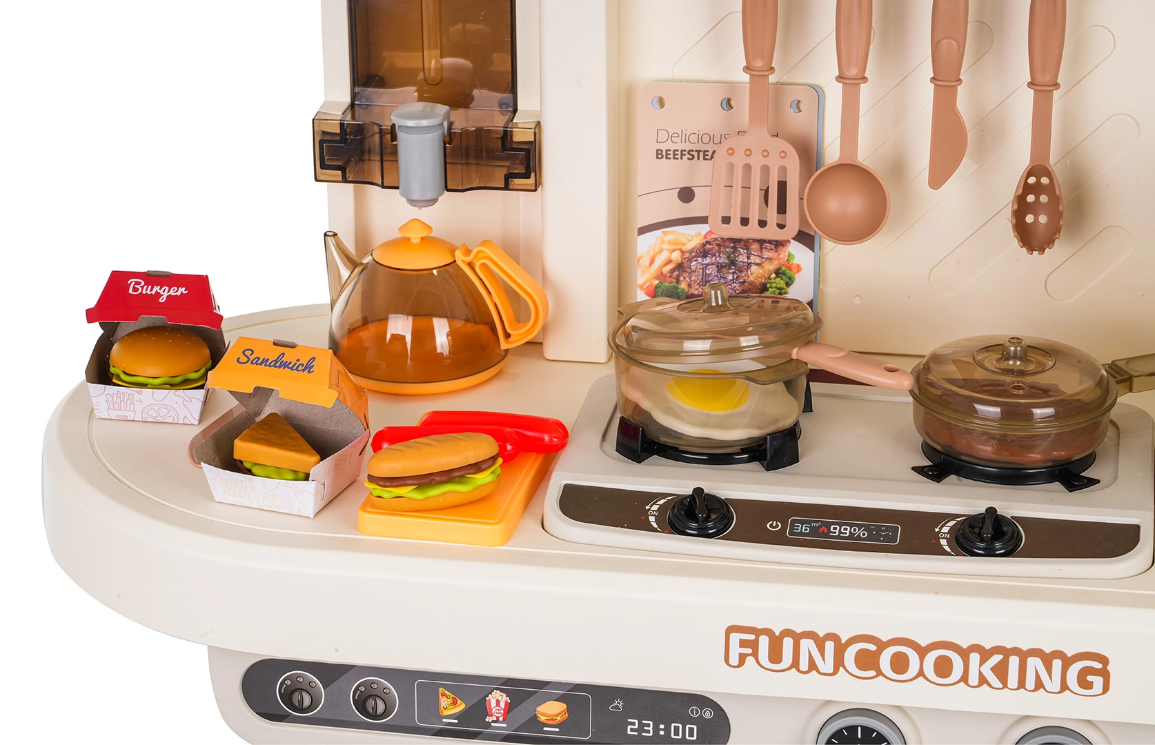 Los fogones iluminados con sonidos de cocción y fritura se complementan con vapor de la olla: los niños vivirán una atmósfera auténtica en cada receta.