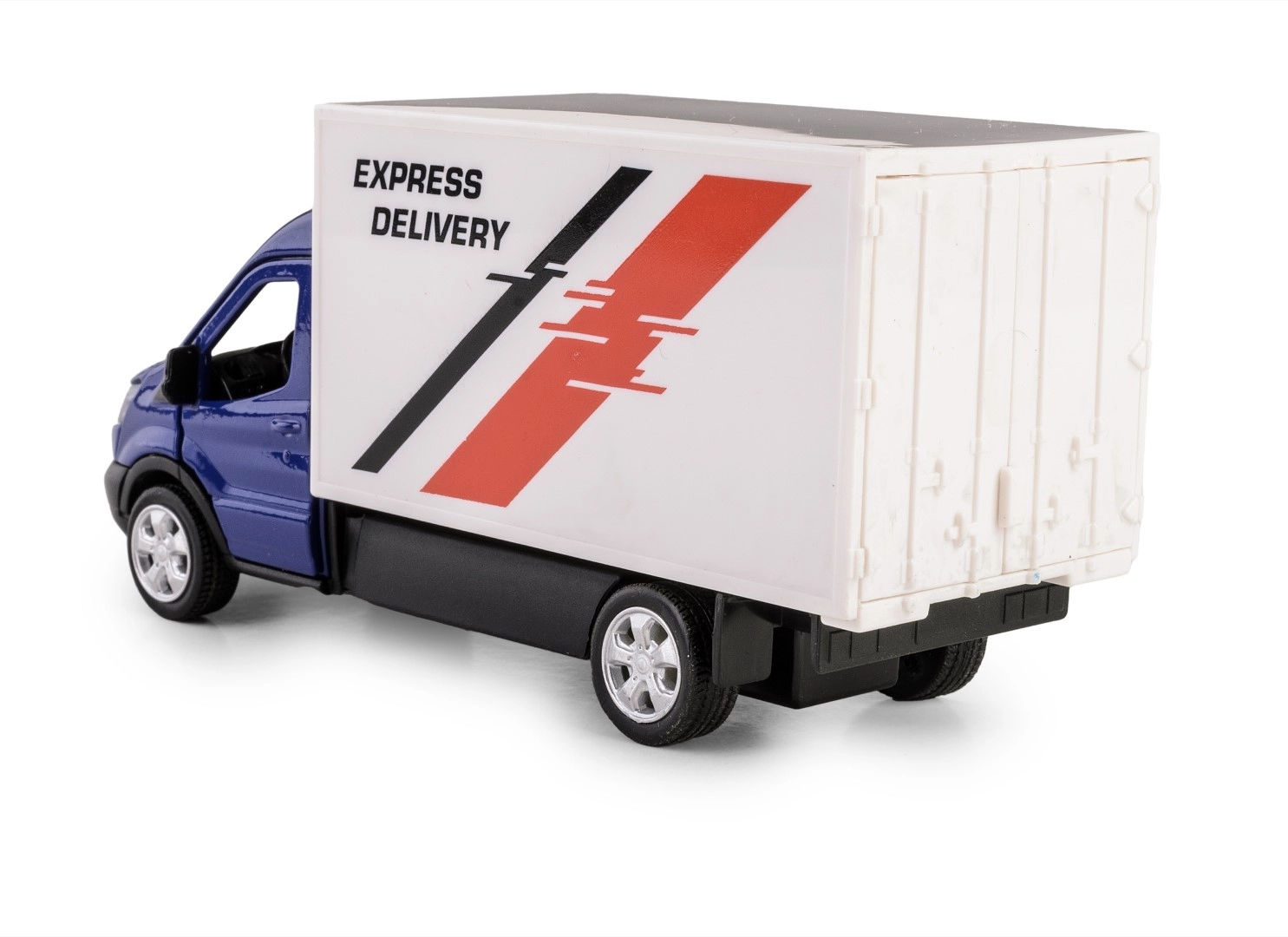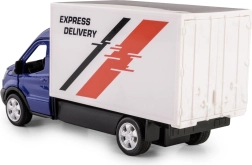 Gracias a las puertas abatibles podrás ver el interior, y el mecanismo pull-back impulsa el vehículo hacia delante tras cargarlo. El aspecto realista se ve realzado por el acabado azul, las llantas plateadas y el llamativo estampado Express Delivery.
