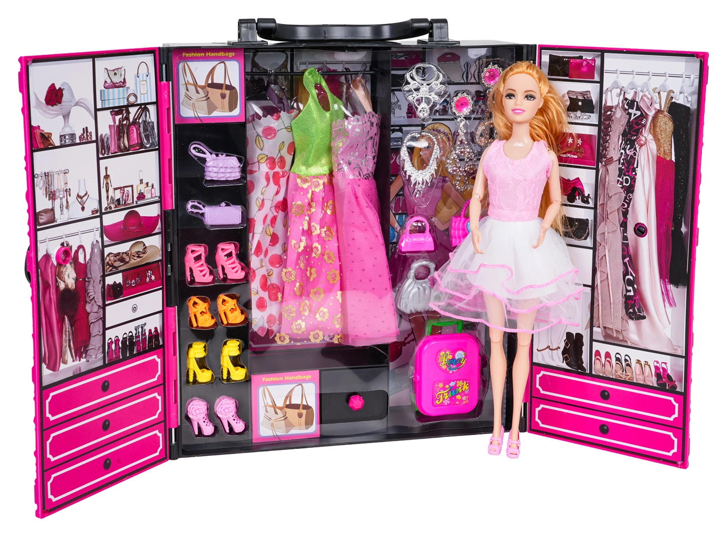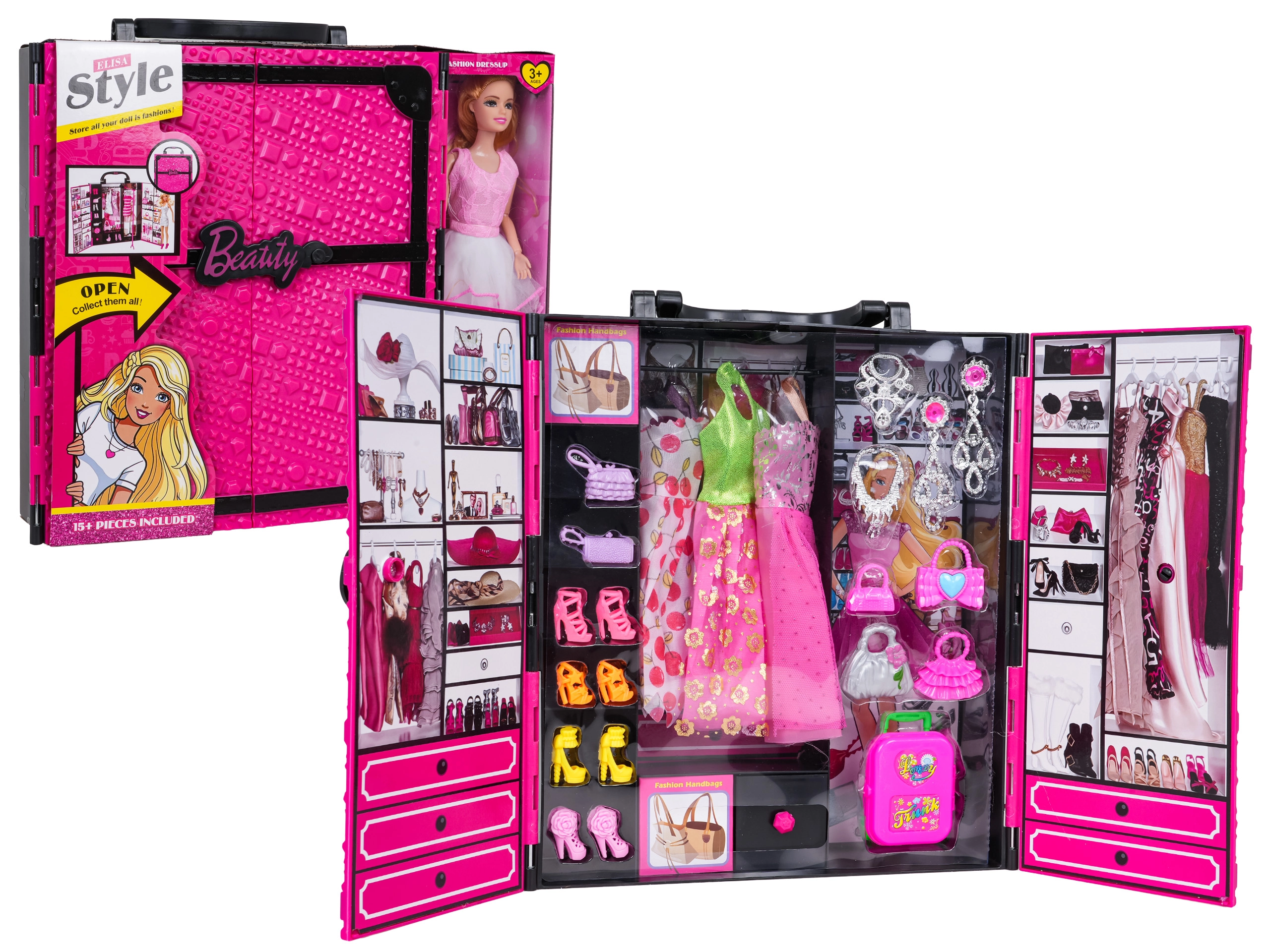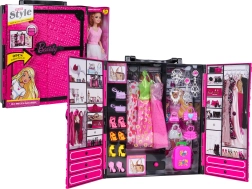 Este completo set combina un gran vestidor portátil y una muñeca con estilo en un vestido precioso. Dentro encontrarás vestidos, zapatos de tacón, bolsos, joyas y otros accesorios organizados en estantes, cajones y perchas. Así, los niños pueden disfrutar del cambio de ropa, el juego narrativo y entrenar la motricidad fina.