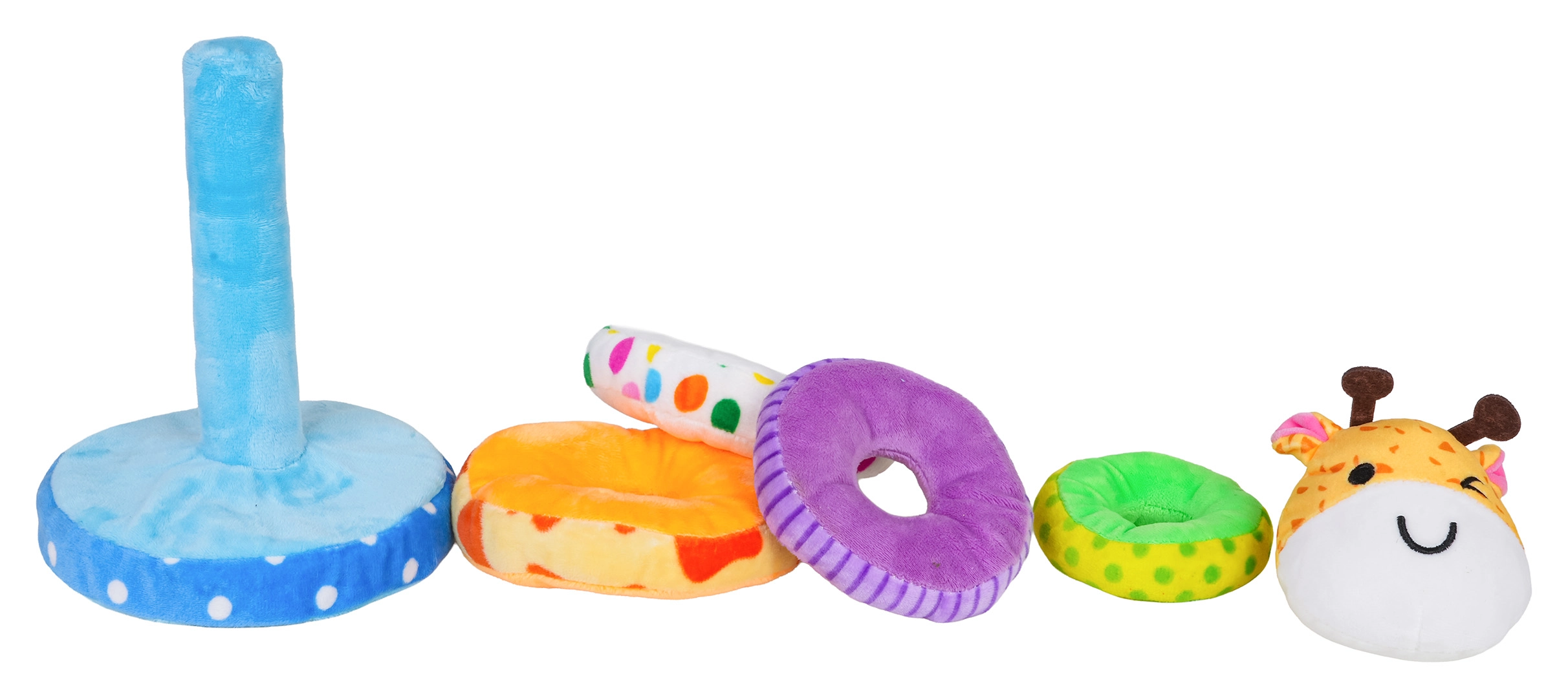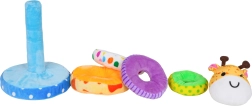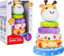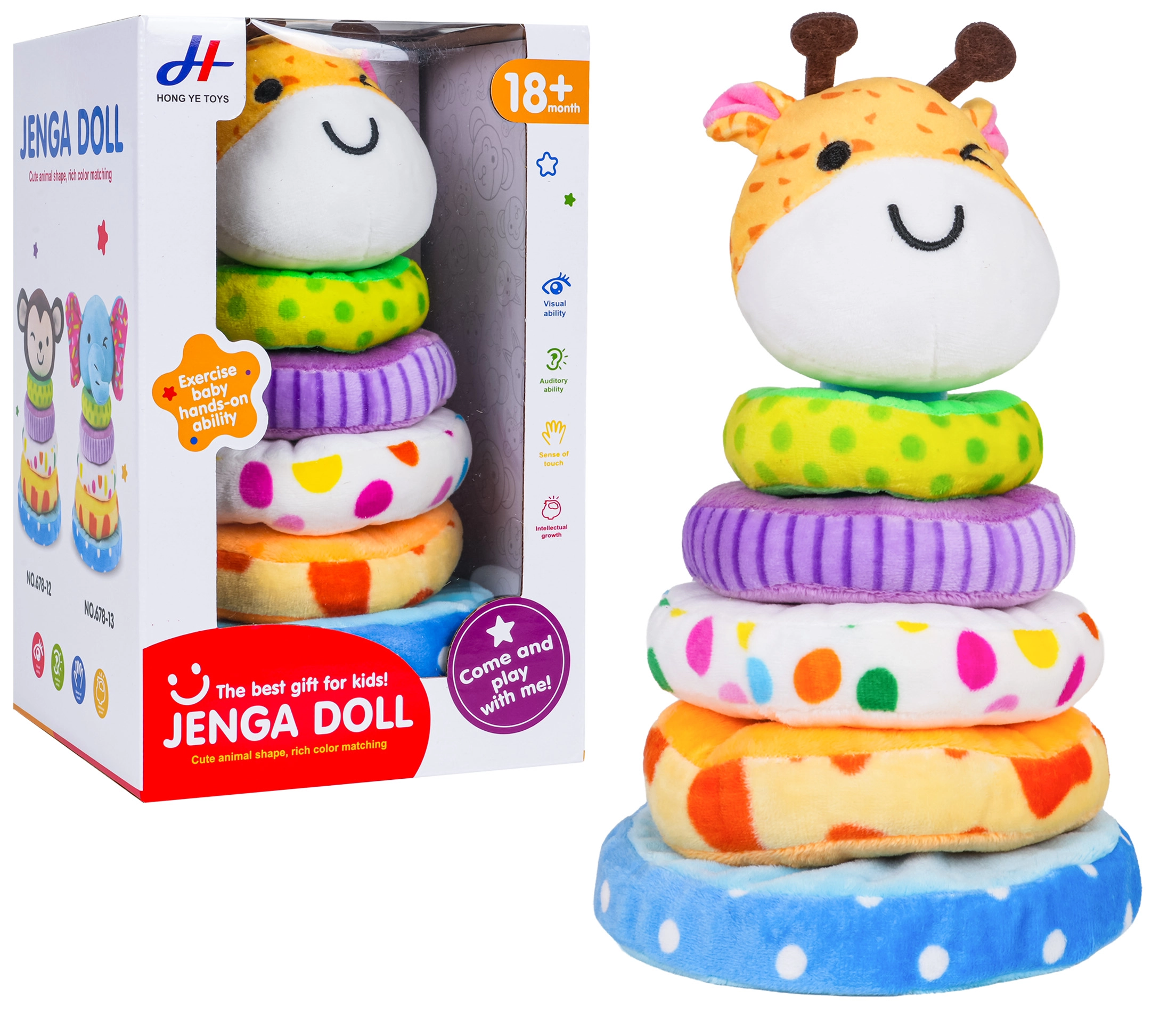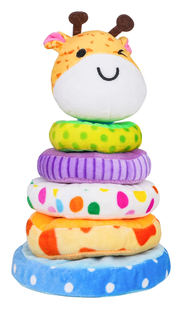 La pirámide apilable suave jirafa ofrece a los niños una forma divertida y segura de aprender. El set incluye una base estable, cuatro aros blanditos de distintos tamaños y una cabeza de jirafa con silbato. Los patrones coloridos y el agradable peluche estimulan el desarrollo sensorial, mientras que apilar los aros entrena la lógica y la paciencia.