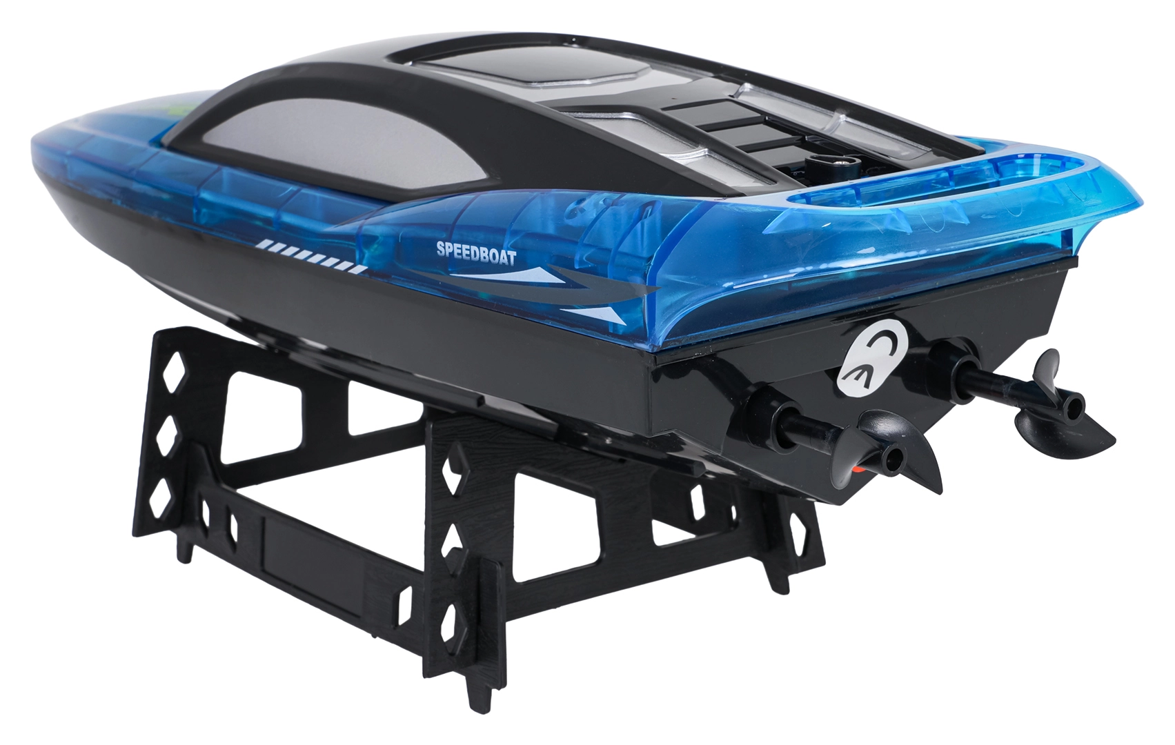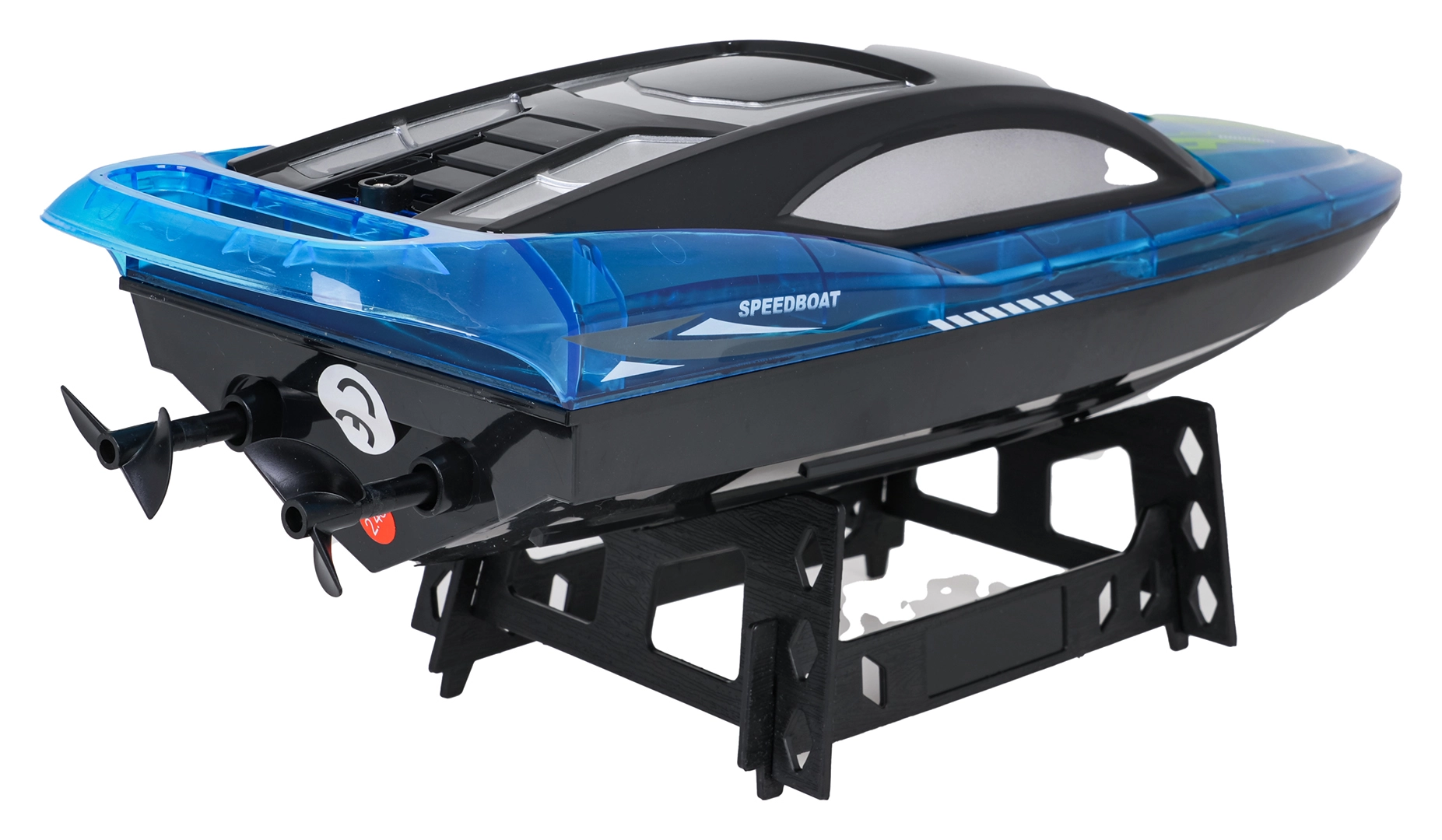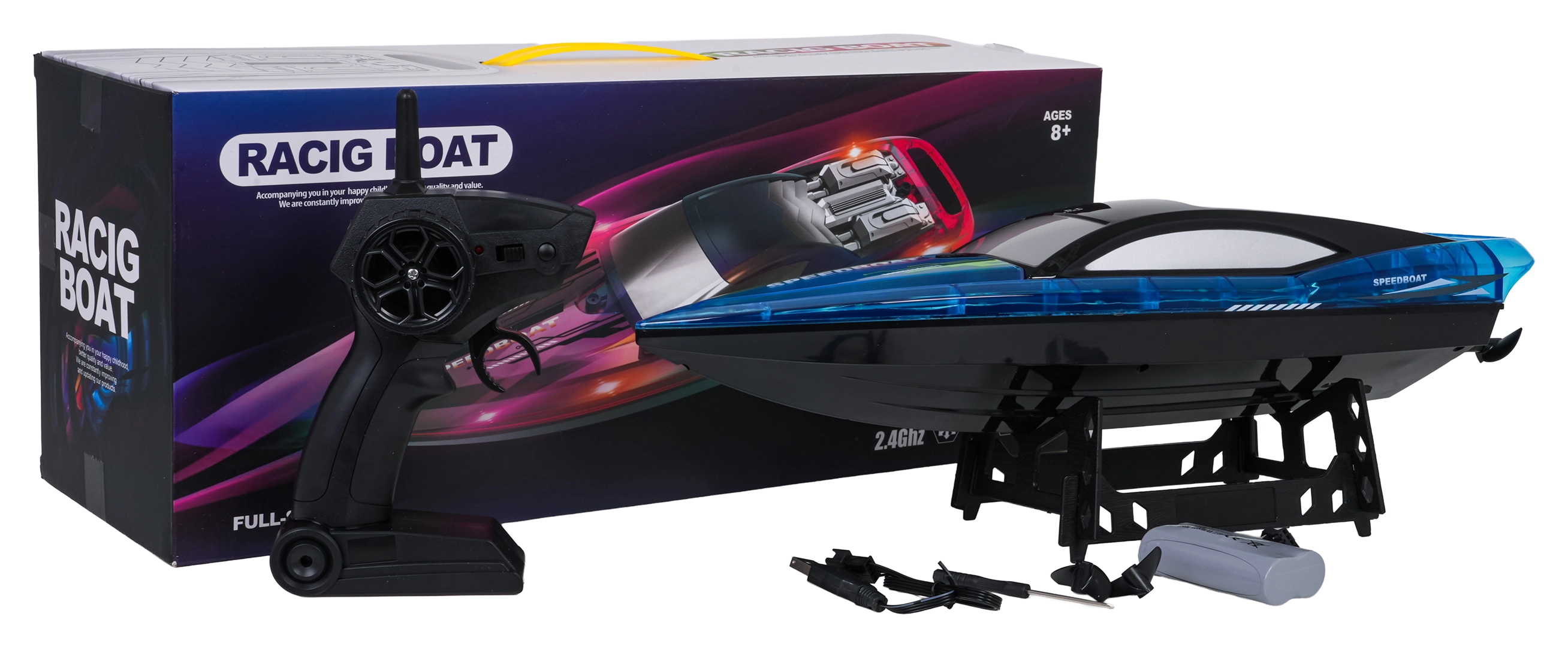 - Lancha, mando a distancia 2,4 GHz, acumulador, cable de carga USB, 2× hélice de repuesto, destornillador, soporte para lancha, manual