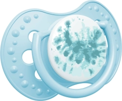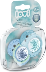 El chupete dinámico LOVI Tie Dye 18m+ imita la succión natural del pecho. La capa homogénea de silicona se contrae y se expande durante la succión; la punta es simétrica y aplanada para un movimiento correcto de la lengua y el cierre natural de la boca. El escudo ligero y ergonómico con orificios de ventilación ayuda a prevenir la irritación de la piel, y el diseño bajo la nariz facilita una respiración libre.