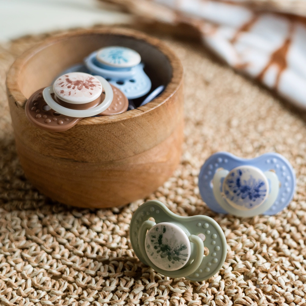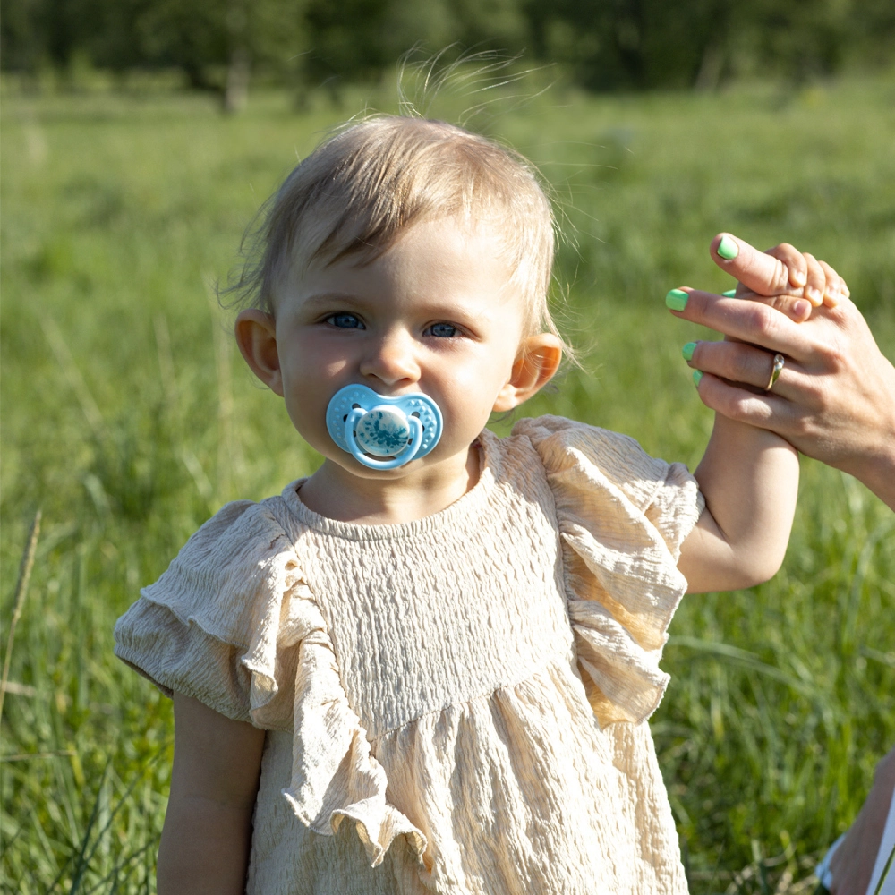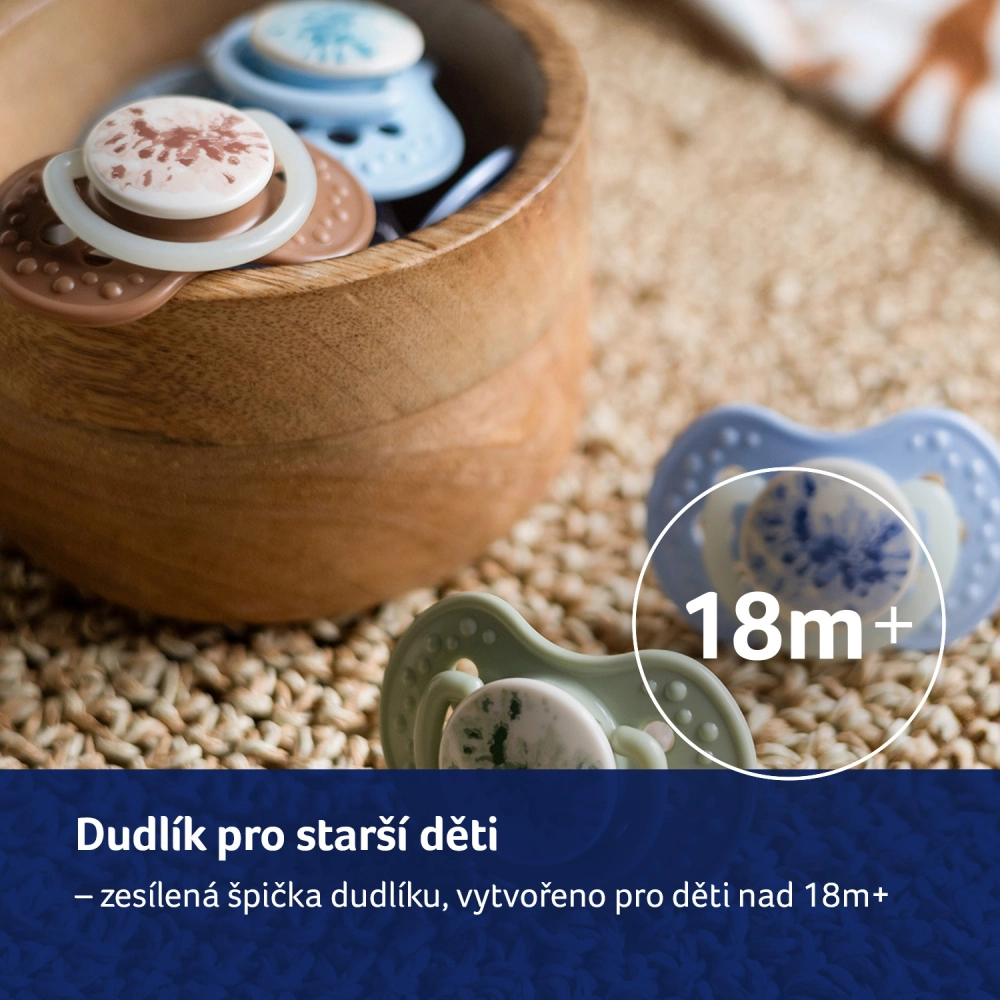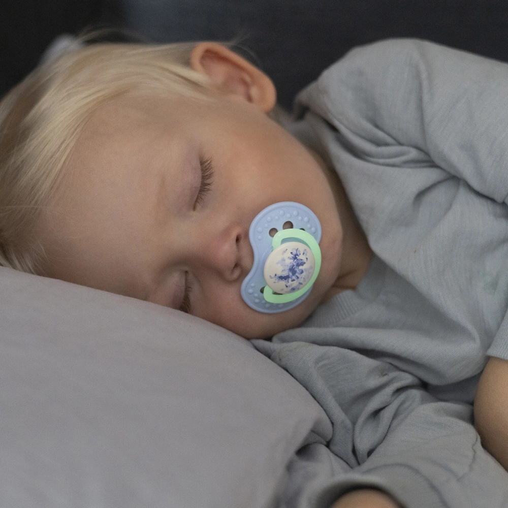 Para niños mayores (18m+), el chupete incorpora una punta de silicona reforzada, más resistente a las mordidas. El asa luminosa permite encontrarlo rápidamente por la noche. Materiales sin BPA, sin sabor ni olor, adecuados para bebés sensibles. Incluye un práctico estuche para almacenamiento higiénico.