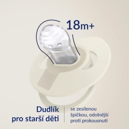 El escudo perfilado, ligero y ergonómico, con orificios de ventilación, minimiza el contacto con la piel y permite la libre circulación del aire, reduciendo el riesgo de irritaciones. La silicona resistente mantiene la forma en la boca; el cuello fino y la tetina aplanada favorecen el correcto trabajo de las encías y la lengua y reducen el riesgo de maloclusión. Su diseño estilizado y armonioso combina perfectamente con el equipamiento del bebé.