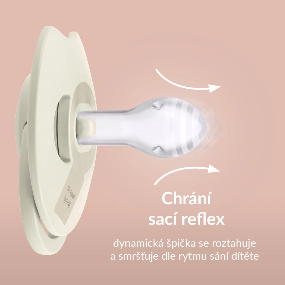 El chupete LOVI PRIME ha sido diseñado en colaboración con especialistas para no alterar el desarrollo natural de la succión, la mordida y el habla (siguiendo las recomendaciones ortodónticas y logopédicas). La tetina dinámica de silicona de distintos grosores se expande y contrae de forma natural según el ritmo de succión, lo que ayuda a mantener la lactancia. La punta simétrica, inspirada en el pezón lleno de leche, ofrece a los bebés una sensación familiar y reconfortante.