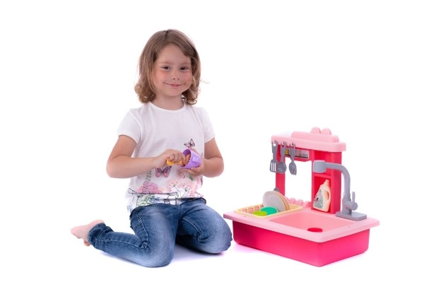 Disfruta de un lavado de platos divertido con este fregadero infantil en color rosa, que incluye un grifo funcional, un depósito de agua y un escurridor desmontable.