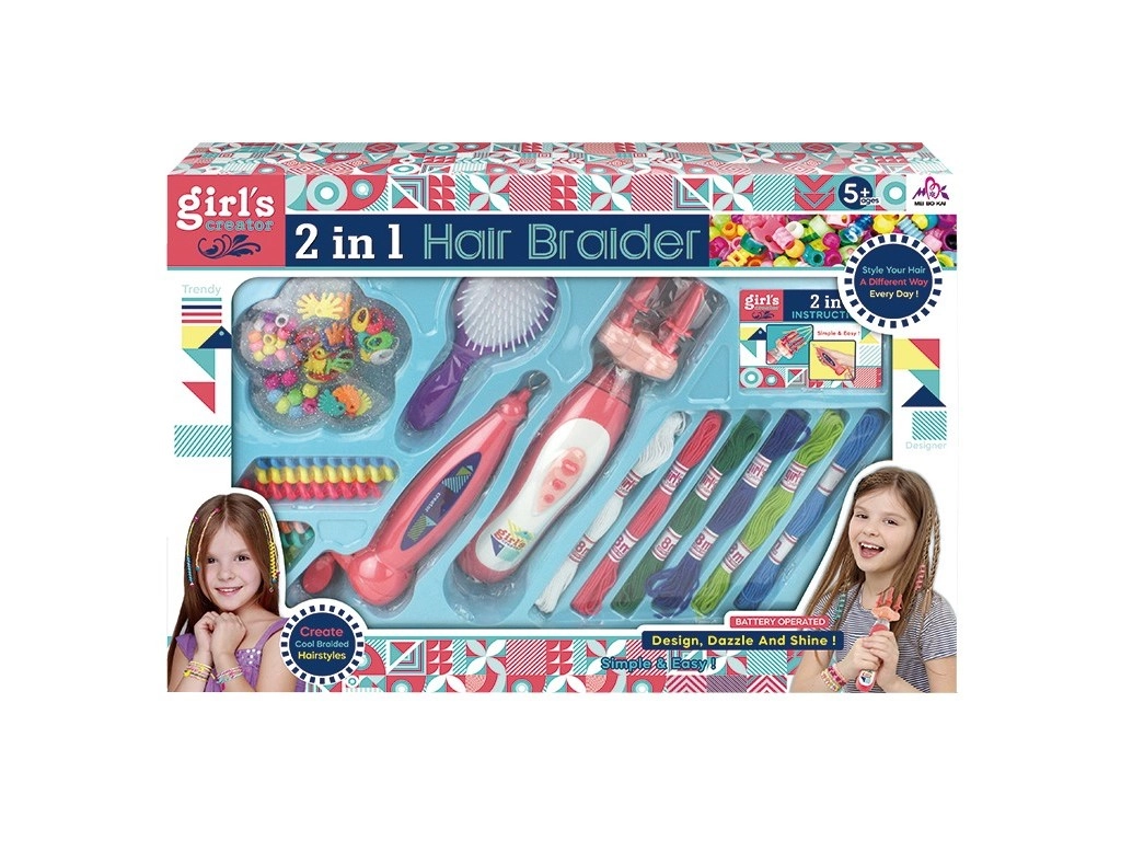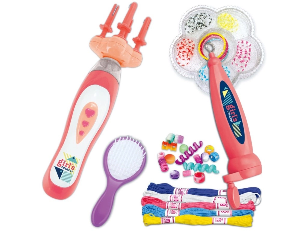 El paquete incluye todo para crear de inmediato: enhebrador para trabajar rápido, varias cuentas para combinaciones variadas, peine para el acabado, hilos de algodón y gomitas para fijar y un trenzador a baterías 2× AA. El set es apto para niños a partir de 3 años.