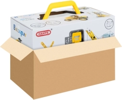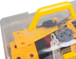 Todas las piezas se guardan de forma segura en una caja transparente con cierre y asa amarilla. Fácil de transportar, orden sin piezas perdidas: ideal para casa y para llevar de viaje.