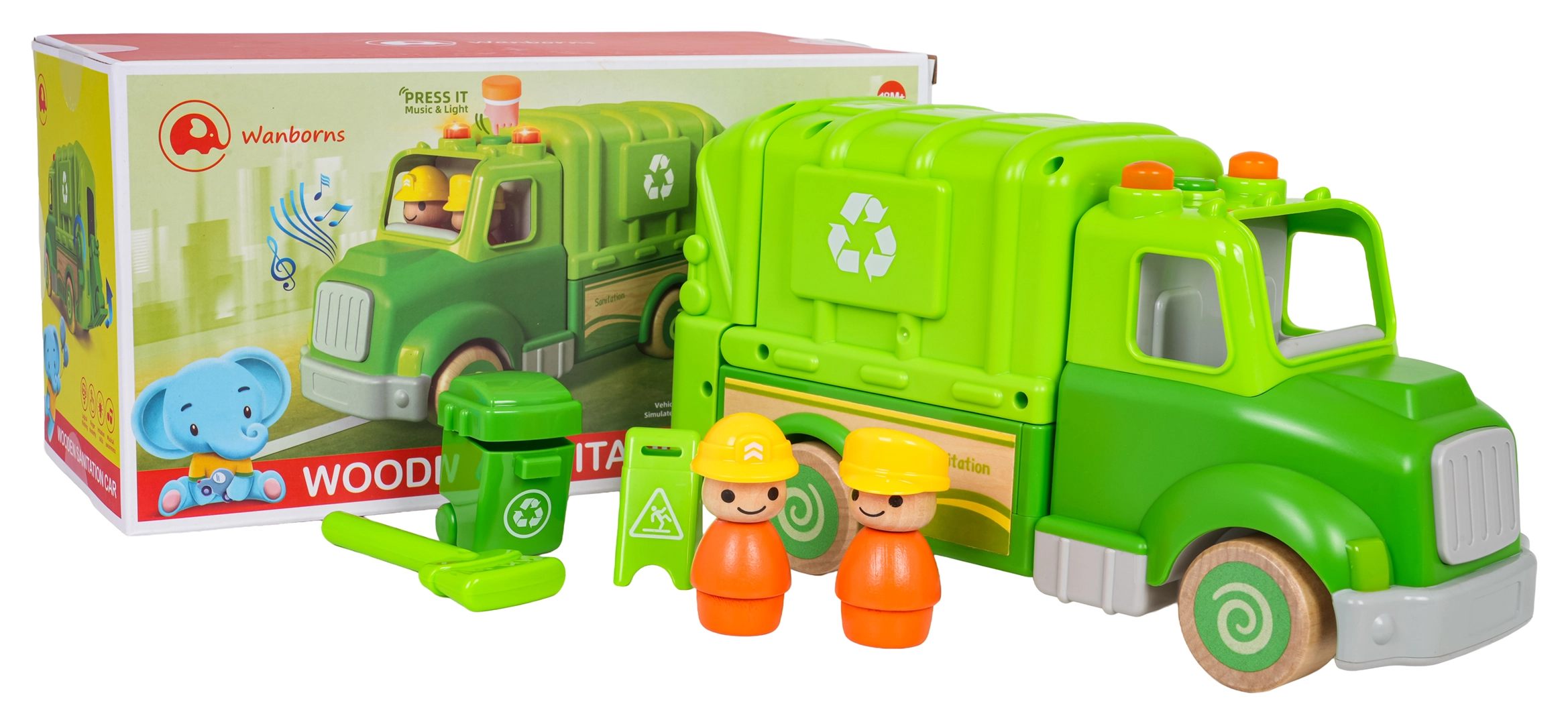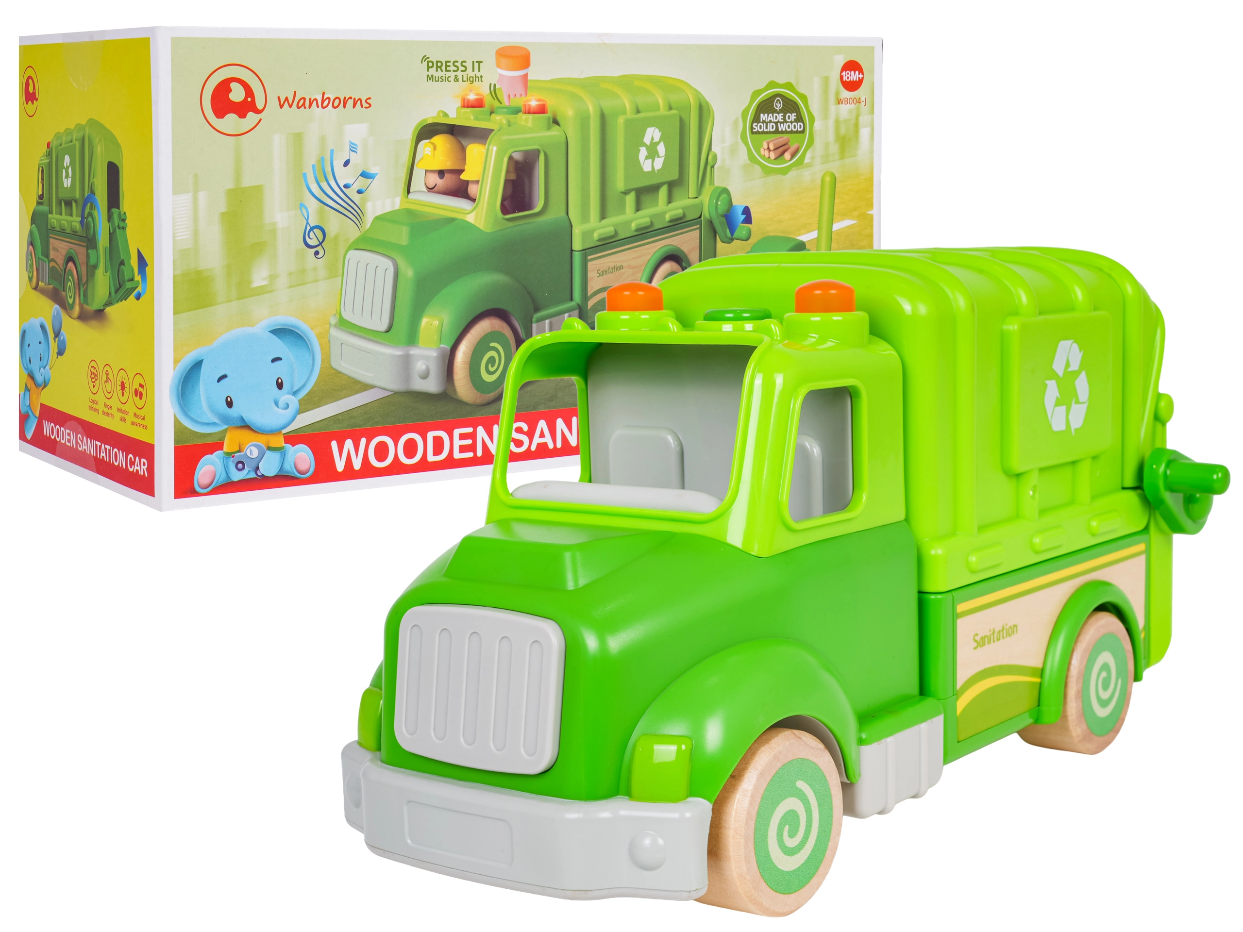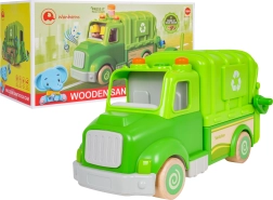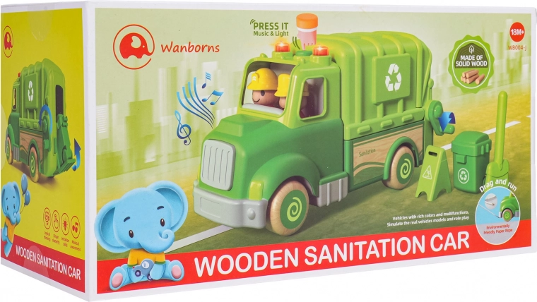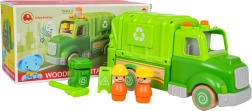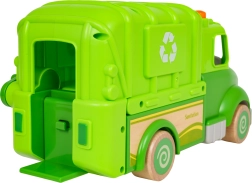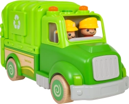 Este camión de basura verde está diseñado para un juego seguro y creativo. Sus formas redondeadas, ruedas de madera y robusta construcción de madera y plástico lo convierten en el juguete ideal para niños. En el techo encontrarás un botón que activa melodías, sonidos de marcha, arranque y claxon, acompañado de lucecitas intermitentes.