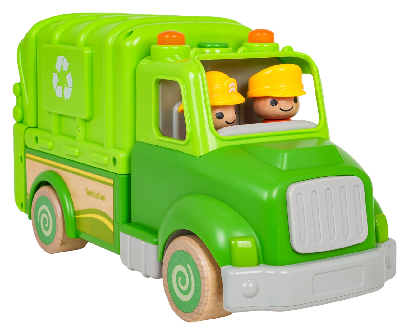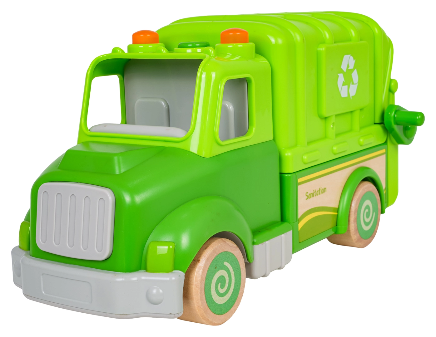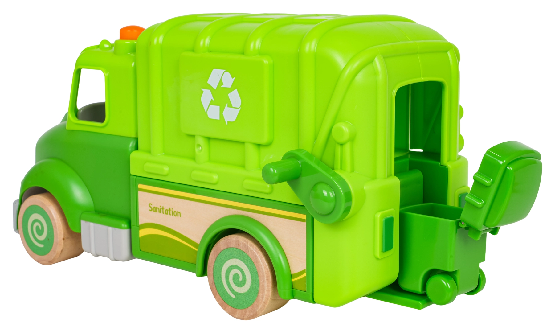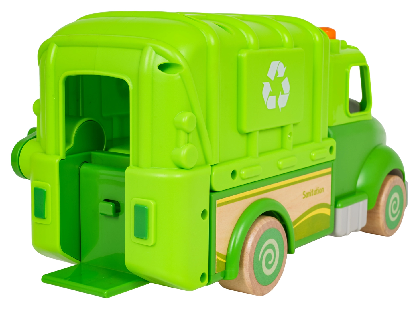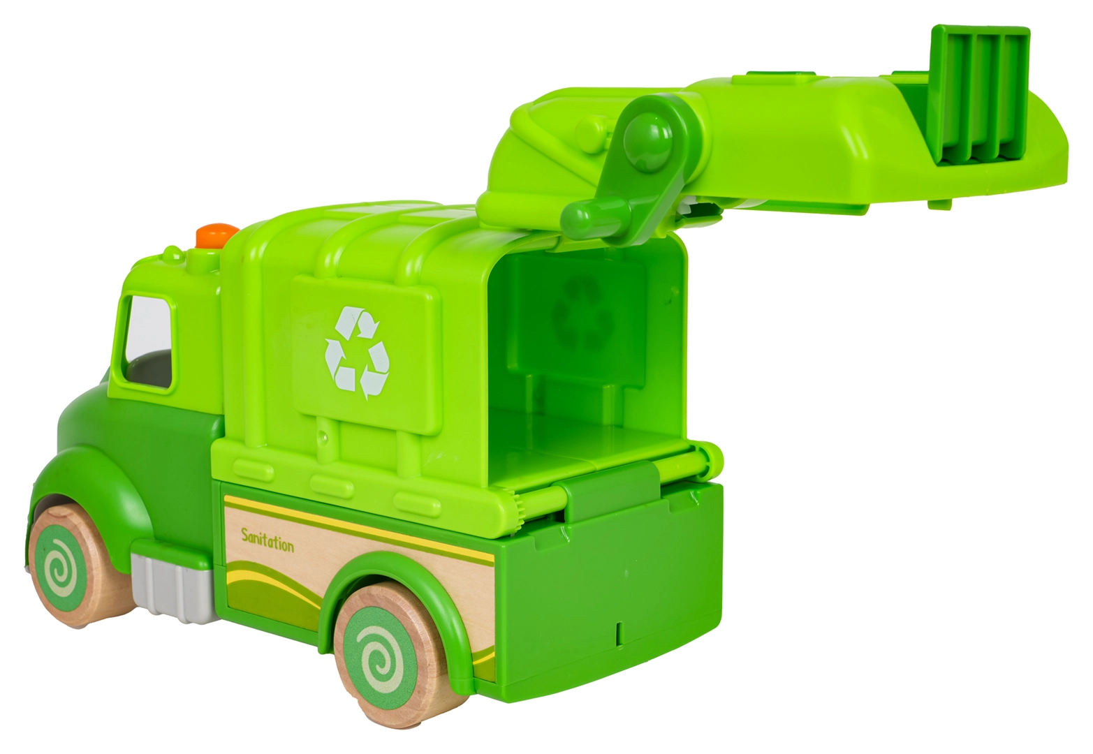 Levanta el cubo, abre la parte trasera y vacía los “residuos” como los basureros de verdad. Diversión y aprendizaje de reciclaje en uno.