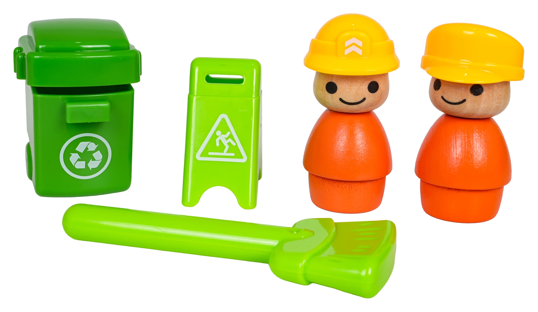 Incluye 2 figuras, un cubo de basura, señal de advertencia y escoba. Todo con diseño seguro y colores llamativos.