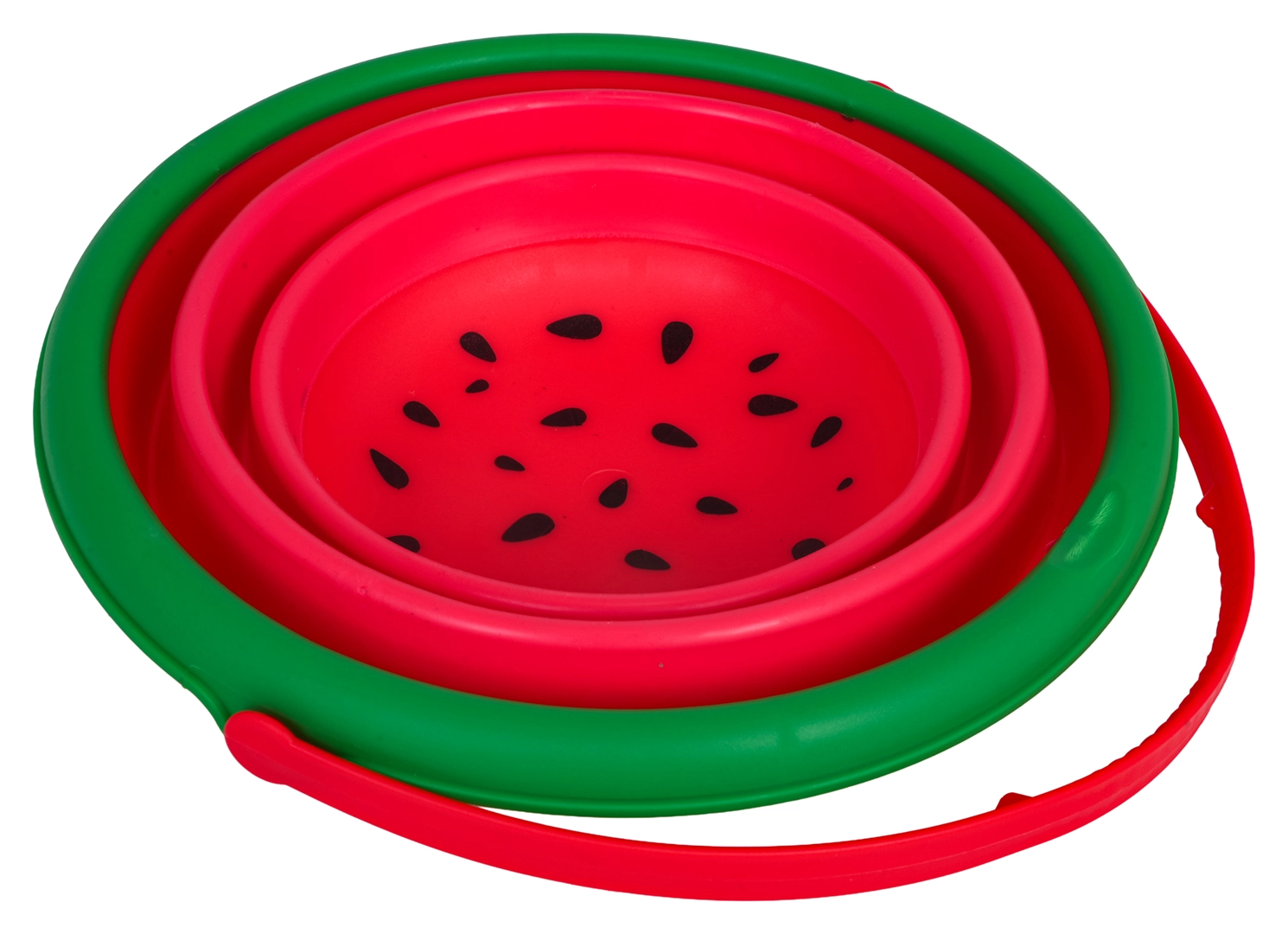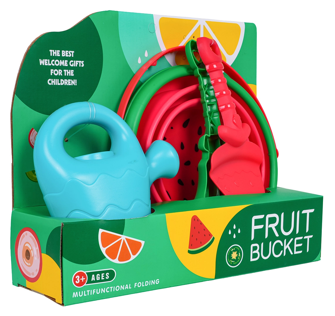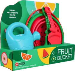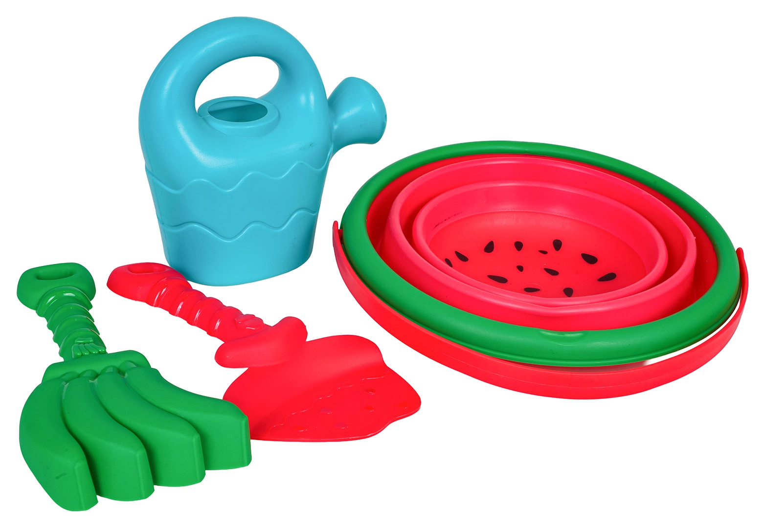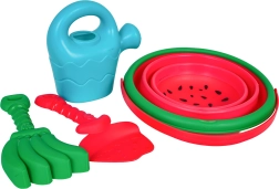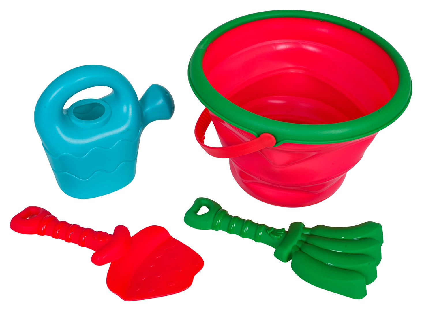 Descubre un práctico set para la arena que hará que cada juego en el agua o en el arenero sea aún más divertido. El cubo plegable de plástico y silicona resistentes se pliega rápidamente en un formato compacto, por lo que cabe en cualquier bolsa. La pala, el rastrillo y la regaderita están diseñados para manos pequeñas: ligeros, seguros y con bordes suaves.