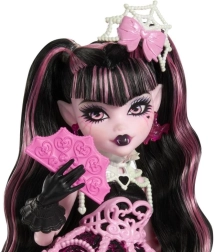 ¡Draculaura te invita a la fiesta más dulcemente espeluznante del siglo! Esta monstruosa icono llega con un precioso conjunto gótico en rosa y negro, complementado con accesorios temáticos: desde un globo con forma de corazón y alas de murciélago hasta un bolso con estilo y un peine. Gracias a su construcción articulada, la muñeca se puede posar y exhibir fácilmente.