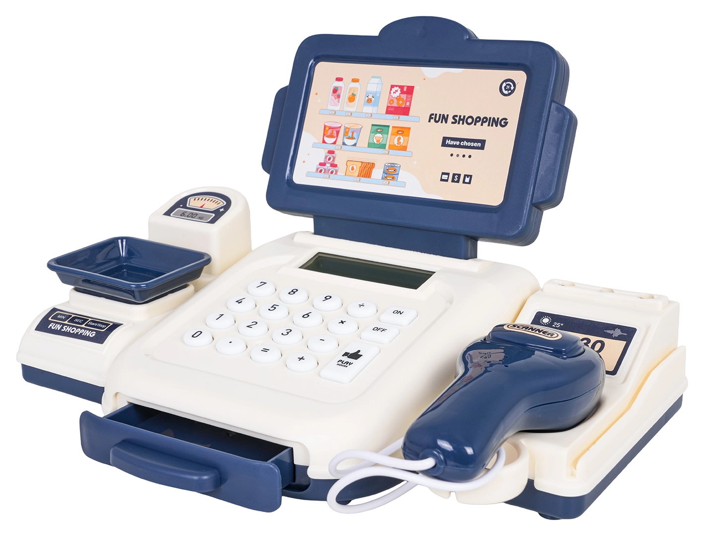 Pon los productos en la báscula, calcula el importe y guarda los billetes de forma segura en el cajón deslizante: jugar a la tienda como en la vida real.