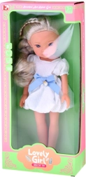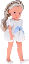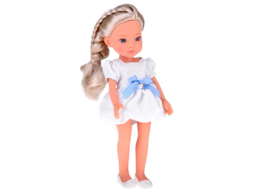 Incluye un encantador vestido blanco con lazo azul y pequeños detalles de perlas, además de bailarinas blancas. El rostro detallado con ojos llamativos y brillantes le otorga una expresión realista, convirtiéndola en una preciosa compañera para la habitación infantil y también para coleccionistas.