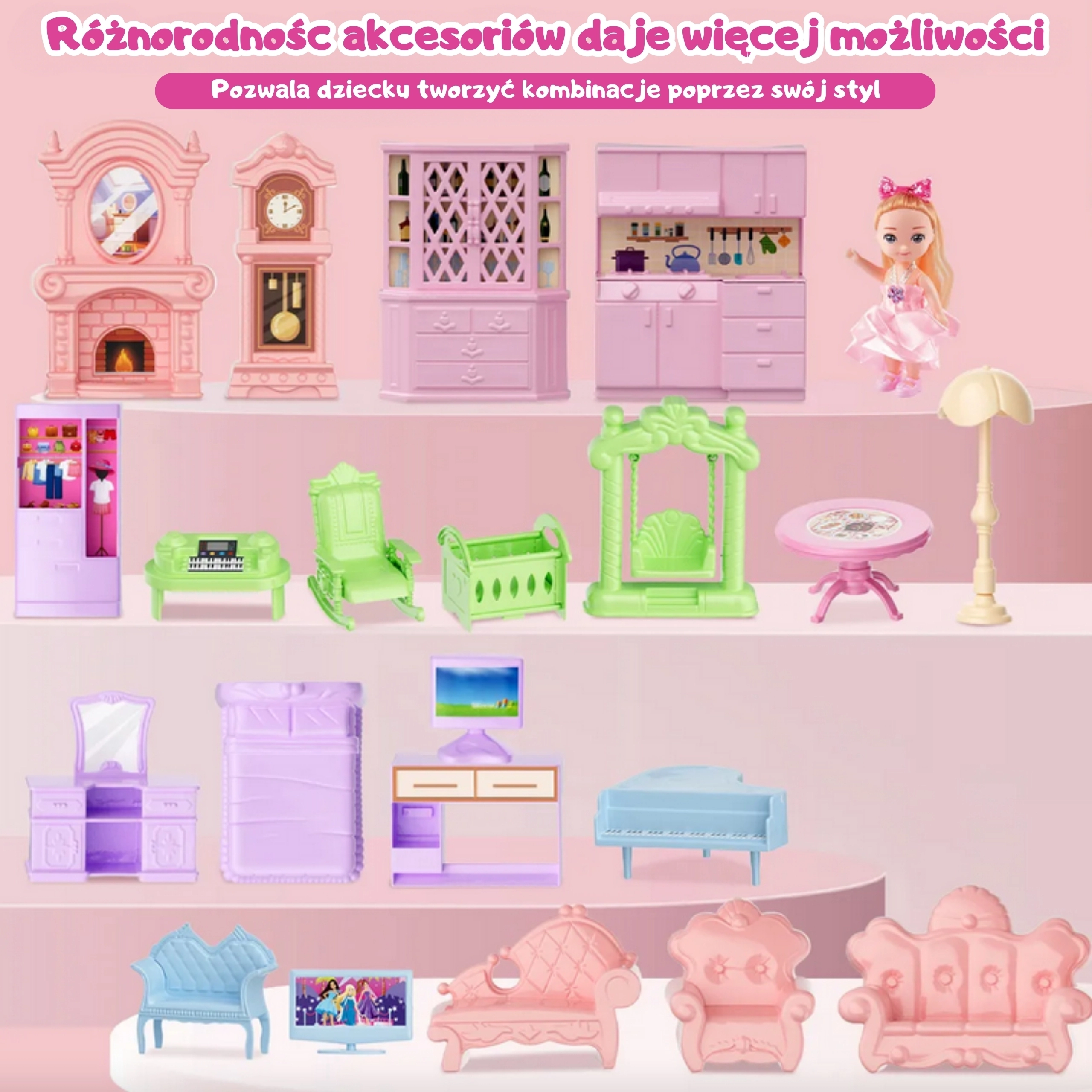 - Casa, muñeca, gatito, muebles y elementos decorativos (columnas, torrecillas, barandillas, escaleras)