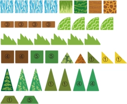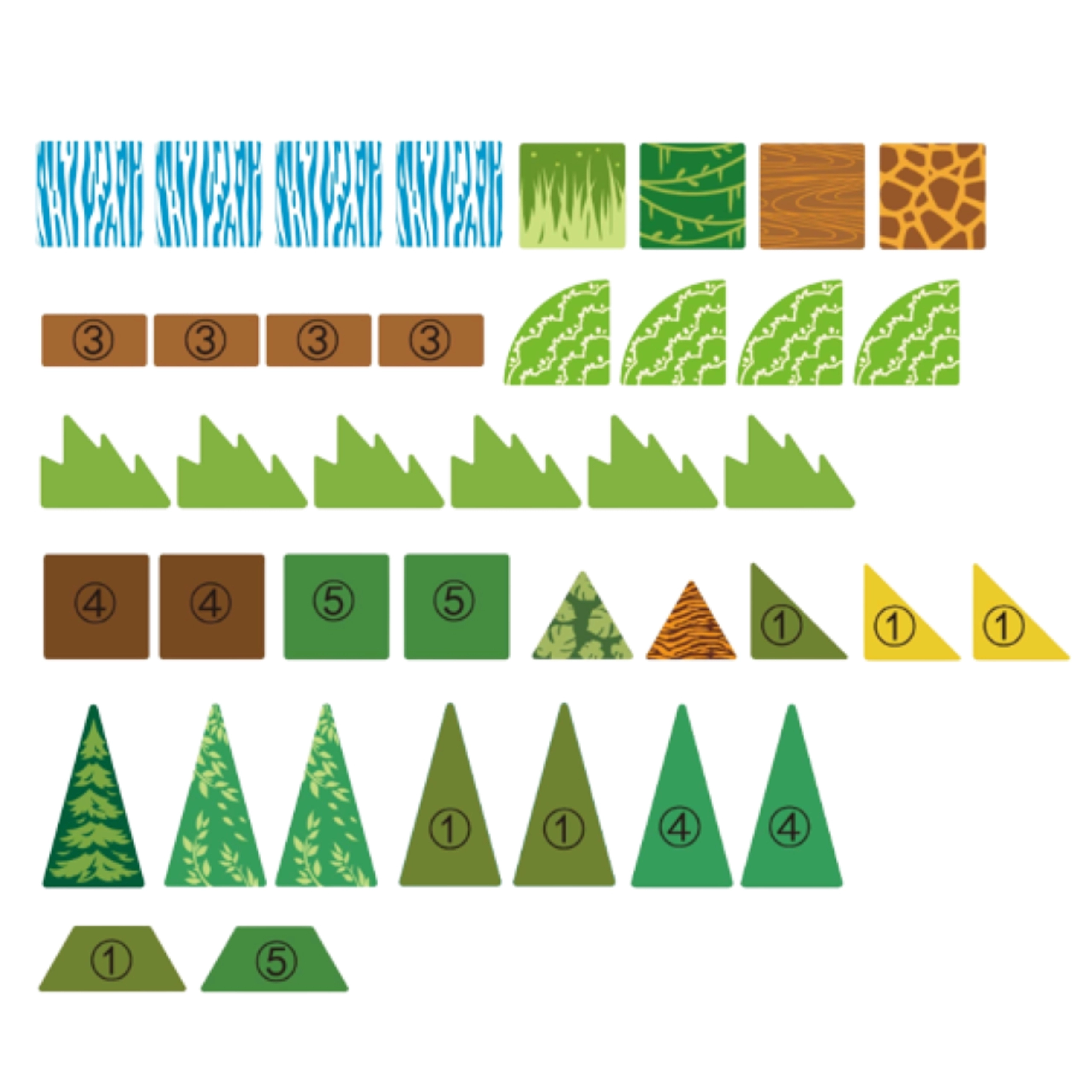 - 45 piezas de diversas formas y colores, incluido cascada, arco, arbustos y árboles