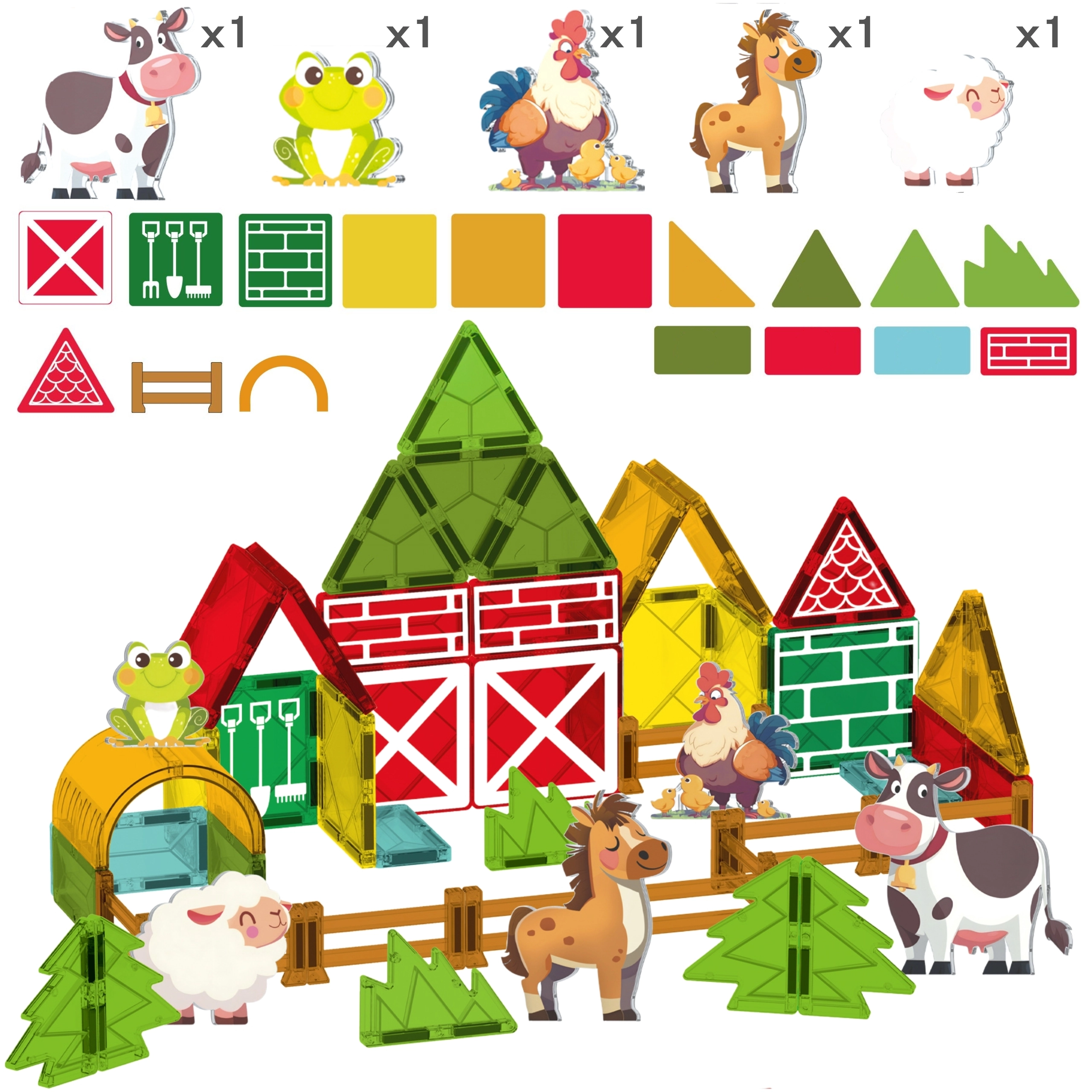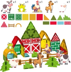 - Qué incluye el paquete: 13 piezas magnéticas cuadradas, 5 triángulos azules, 2 triángulos amarillos, 9 rectángulos rojos, 1 semicírculo naranja, 9 vallas, 5 figuras de animales (oveja, caballo, gallo, rana, vaca) y un juego de pegatinas.