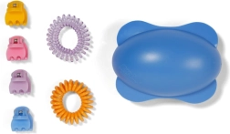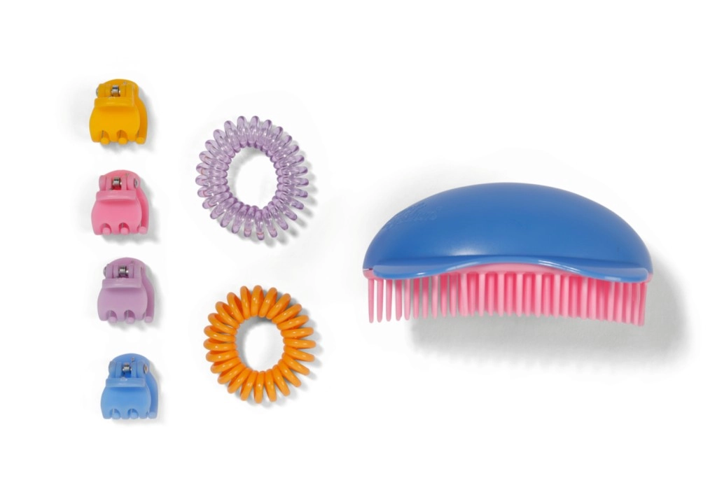 El cabello de nailon de alta calidad se peina y moldea con facilidad. El set incluye un cepillo, 2 gomas y 4 pinzas para peinados creativos.