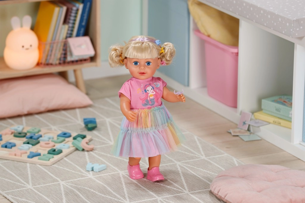 Carla lleva una adorable camiseta con estampado, una falda de tul arcoíris y zapatos a la moda. El cuerpo rígido también es apto para el agua, por lo que podrás divertirte durante el baño. La excelente fabricación y los materiales resistentes encantarán a niños y padres.