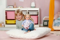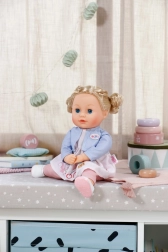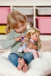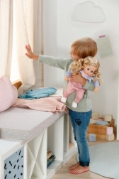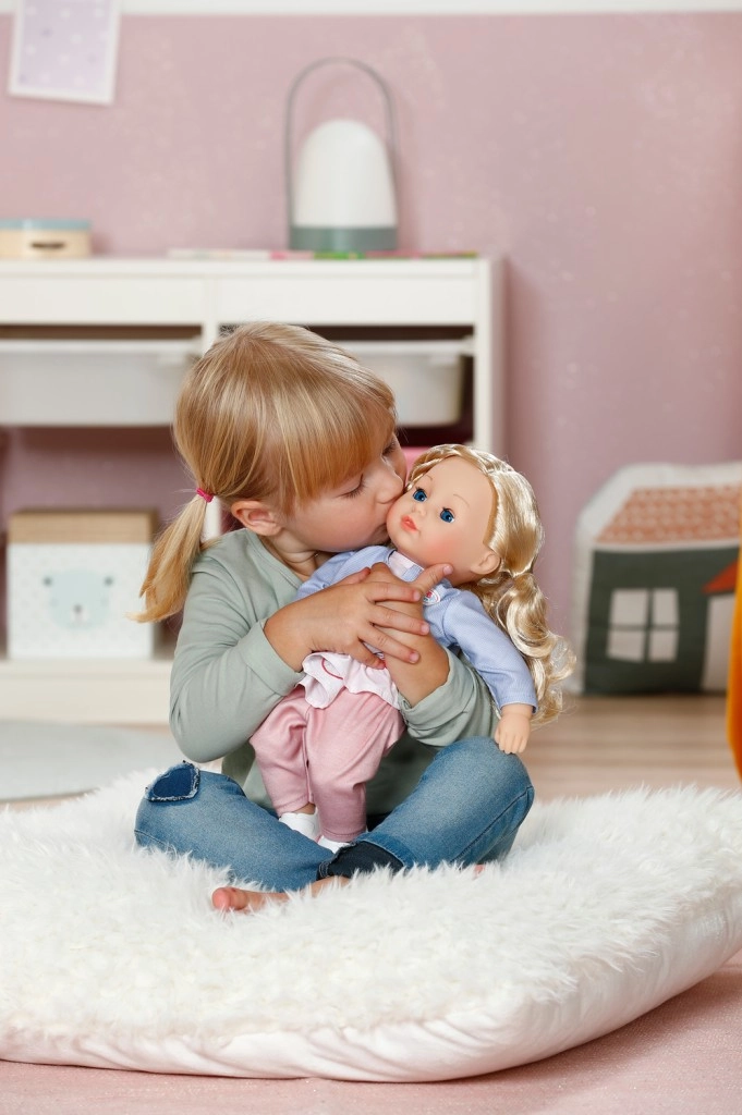 El paquete incluye un conjunto de ropa completo: delicado vestido con chaqueta ligera, cómodos leggings y zapatos. Gracias a sus extremidades articuladas, la muñeca se sienta y se viste con facilidad. Jugar con la muñeca desarrolla la motricidad fina, la empatía y la imaginación: la elección ideal como primera muñeca para los más pequeños.