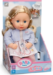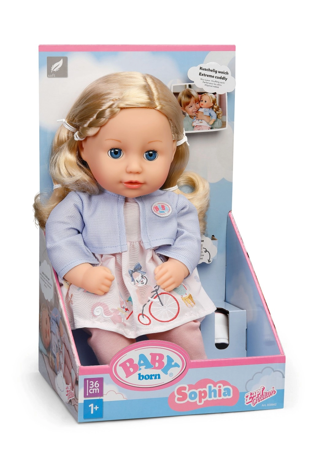 Conoce a Sofía, una compañera dulce para el juego diario. La muñeca BABY born Sophia con atuendo rosa encanta con su cuerpo blandito ideal para abrazar, sus realistas ojos que parpadean y su cabello abundante y de calidad que invita a peinar y crear peinados.