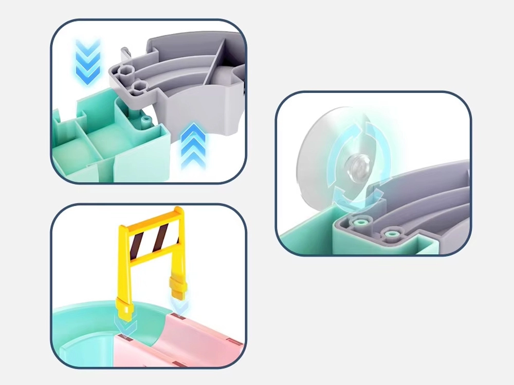 El canal curvado y el final con colador crean una mini ducha. Los niños observan el flujo del agua y el movimiento de los cochecitos en cápsula por el recorrido.