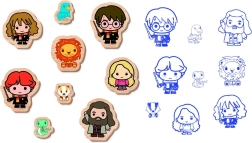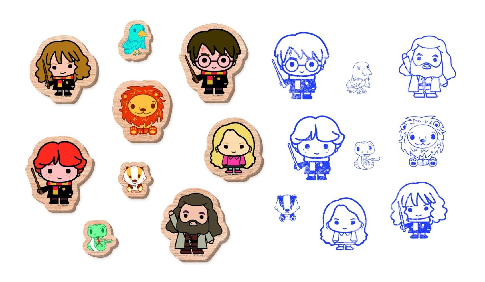 - 9 sellos de madera con formas con motivos populares de HARRY POTTER para crear sin límites.