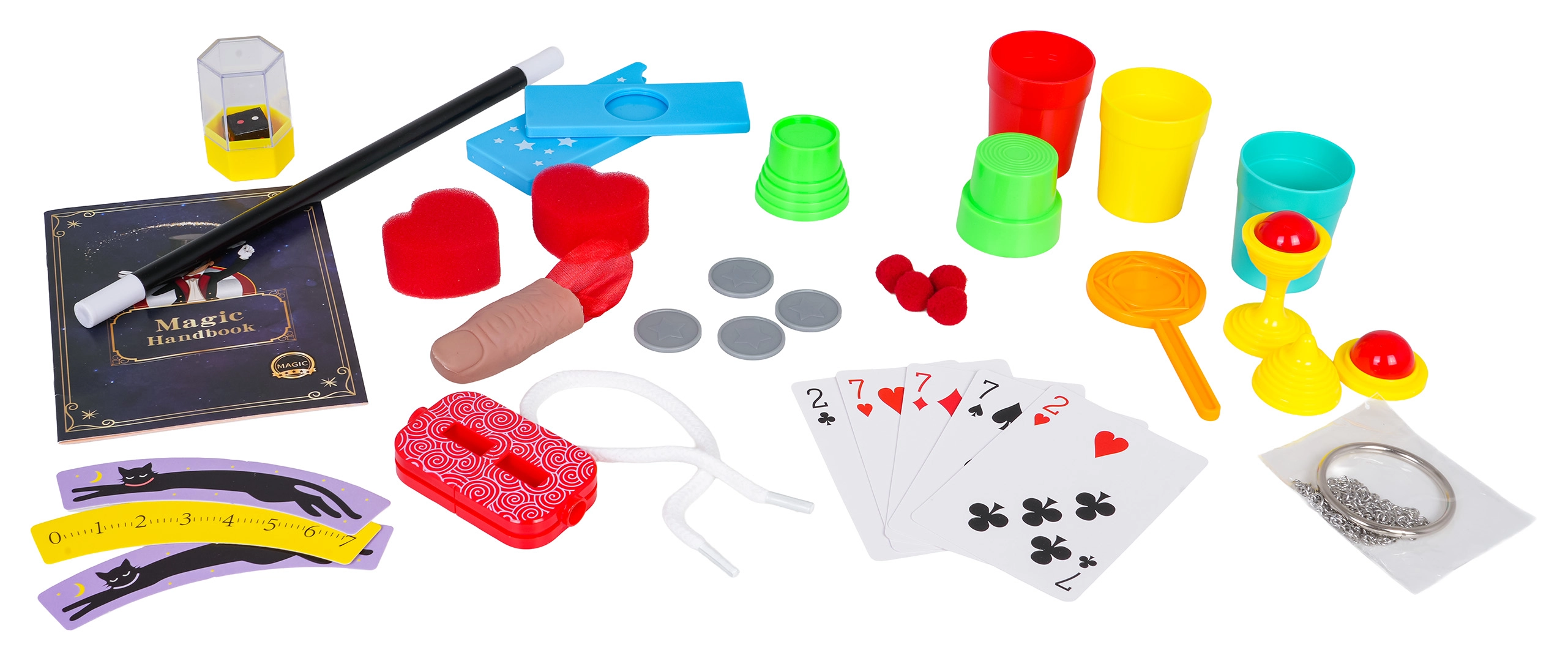 En el paquete encontrarás diversos accesorios de magia: desde una varita mágica, vasitos y monedas hasta utilería especial para dirigir la atención del público. Cada truco está claramente explicado y adaptado a los niños, para que disfruten del éxito y desarrollen su autoconfianza.