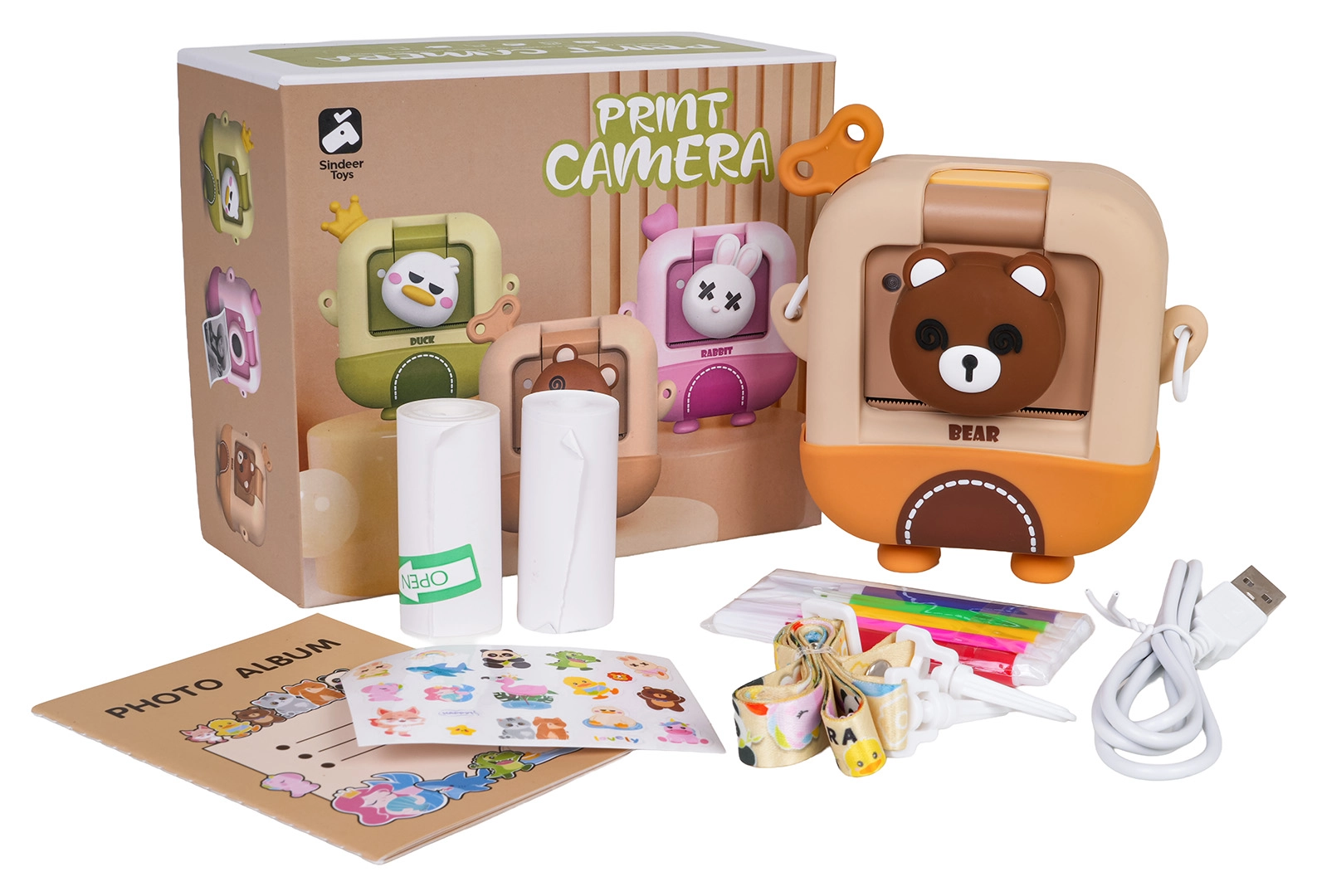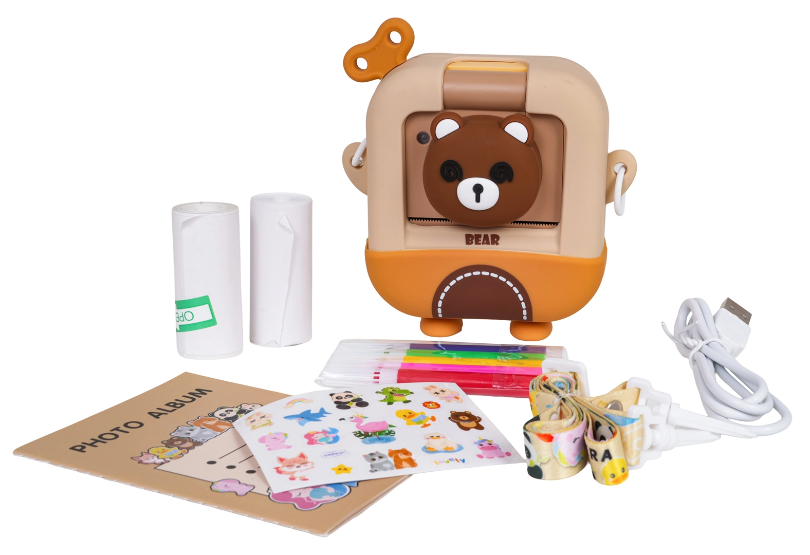 Esta adorable cámara infantil con diseño de osito puede imprimir al instante fotografías en blanco y negro en papel térmico justo después de tomarlas. Incluye un amplio conjunto de accesorios con 2 rollos de papel térmico, rotuladores de colores para colorear las fotos, cable USB, lanyard, pegatinas y un mini álbum. La cámara admite grabación de video y divertidos efectos y funciona con la batería de 3,7 V incluida: un regalo creativo ideal para niños a partir de 3 años.