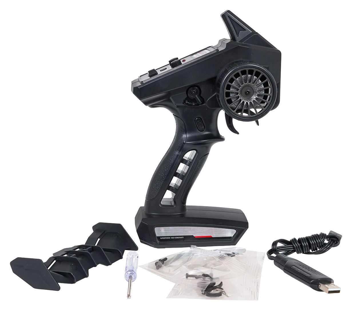 El control a 2,4 GHz asegura un alcance fiable sin interferencias; el coche se desplaza con fluidez en todas las direcciones y, gracias a los grandes neumáticos de goma de alta adherencia, mantiene la trazada incluso en tramos rápidos. La alimentación corre a cargo de una batería Li‑ion de 7,4 V 1300 mAh (incluida); el mando requiere 3× AA 1,5 V (no incluidas).