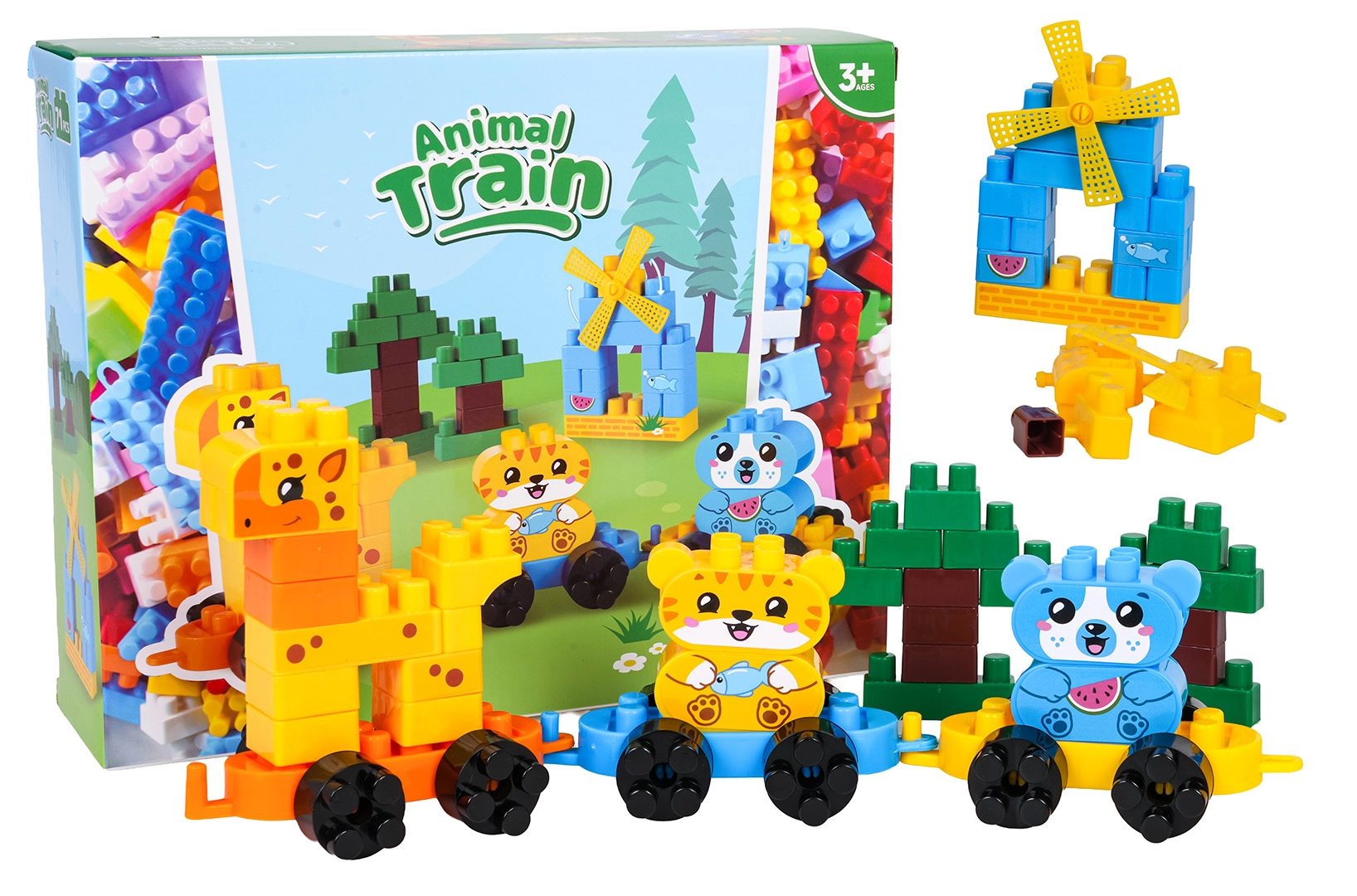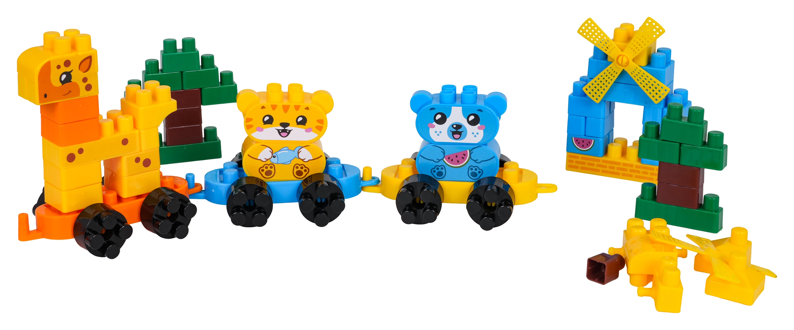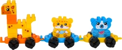 Arma la jirafa, el tigre y el osito sobre chasis con ruedas y únelos en un colorido tren para aún más diversión.