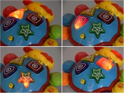 El botón con la nota musical activa melodías alegres acompañadas de luces parpadeantes para estimular los sentidos y aumentar la diversión.