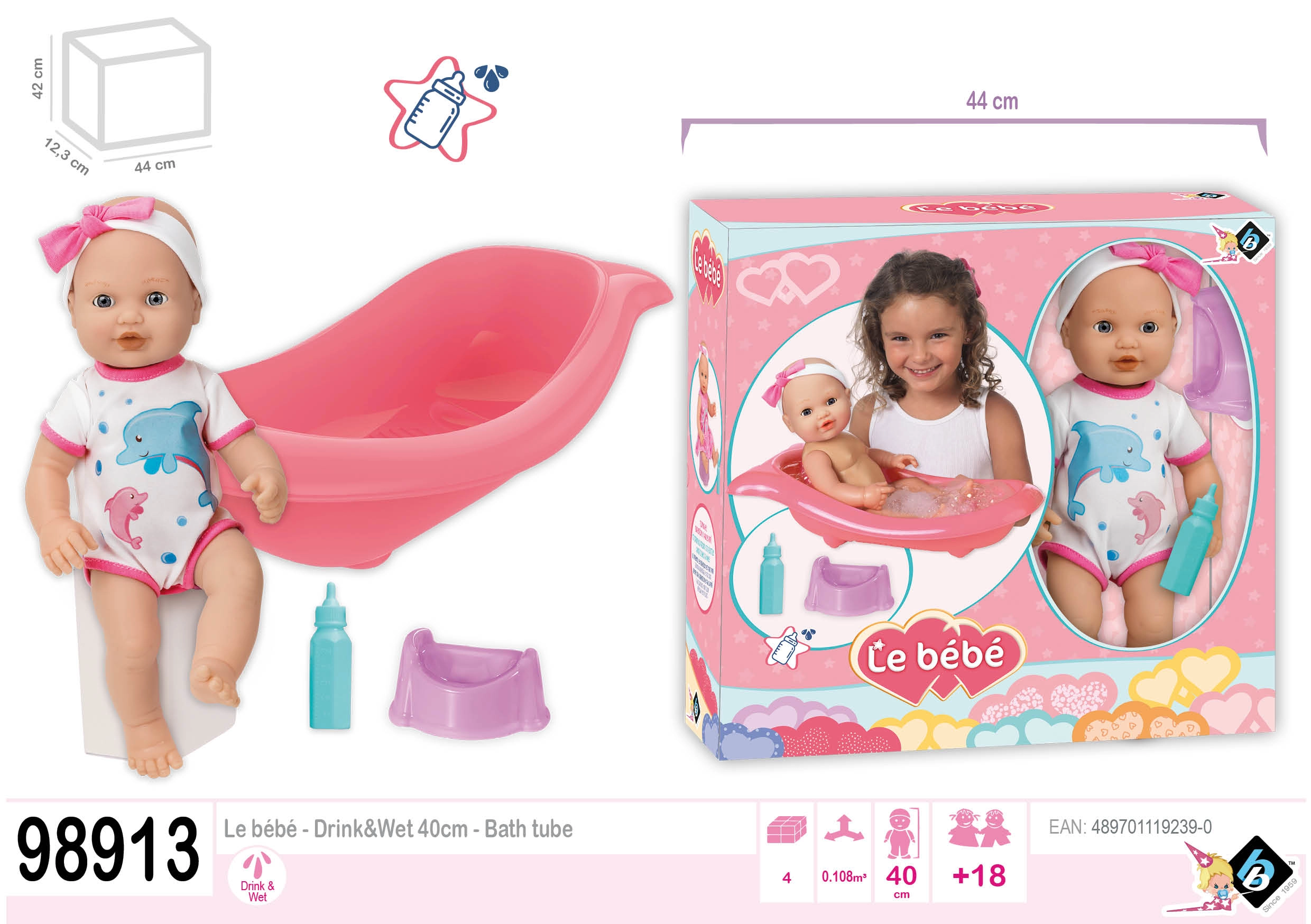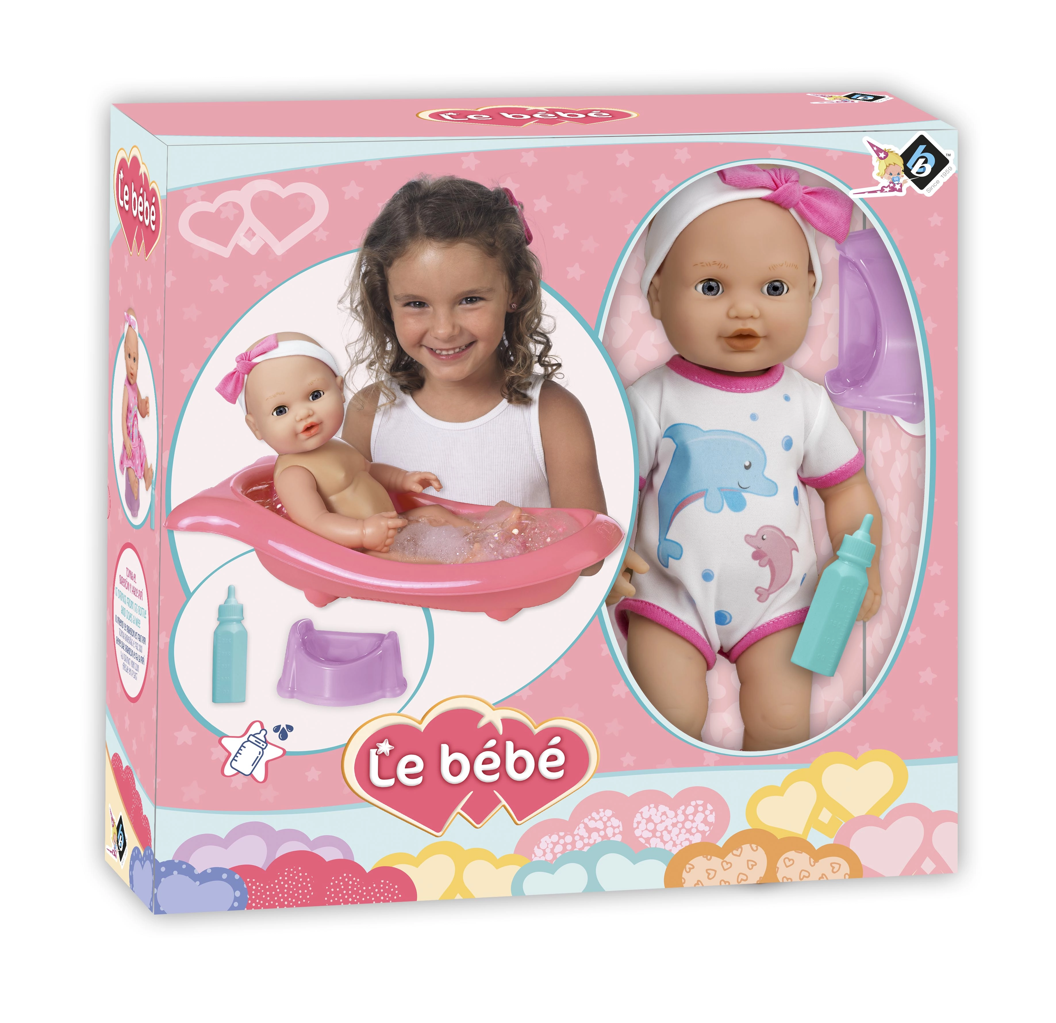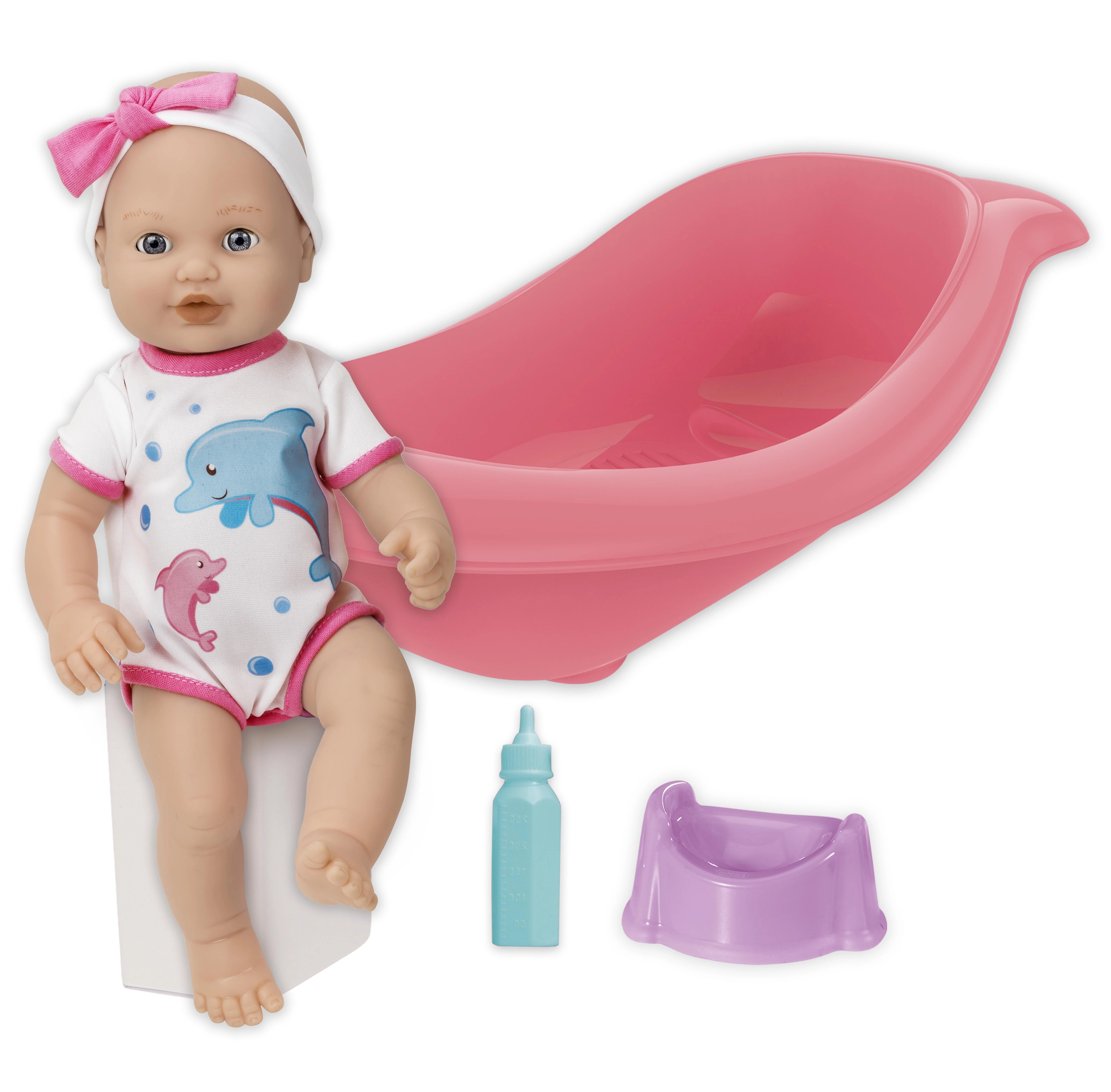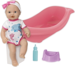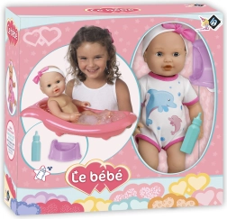 Una adorable muñeca con set para baño y cambio alegrará a cualquier niño. El paquete incluye una bañerita de 41 cm de largo, un biberón y un orinal. La muñeca tiene cabeza y extremidades móviles y al colocarla de espaldas cierra los ojos. Gracias a la función de hacer pis después de beber del biberón, los niños disfrutan de un juego de cuidado realista.
