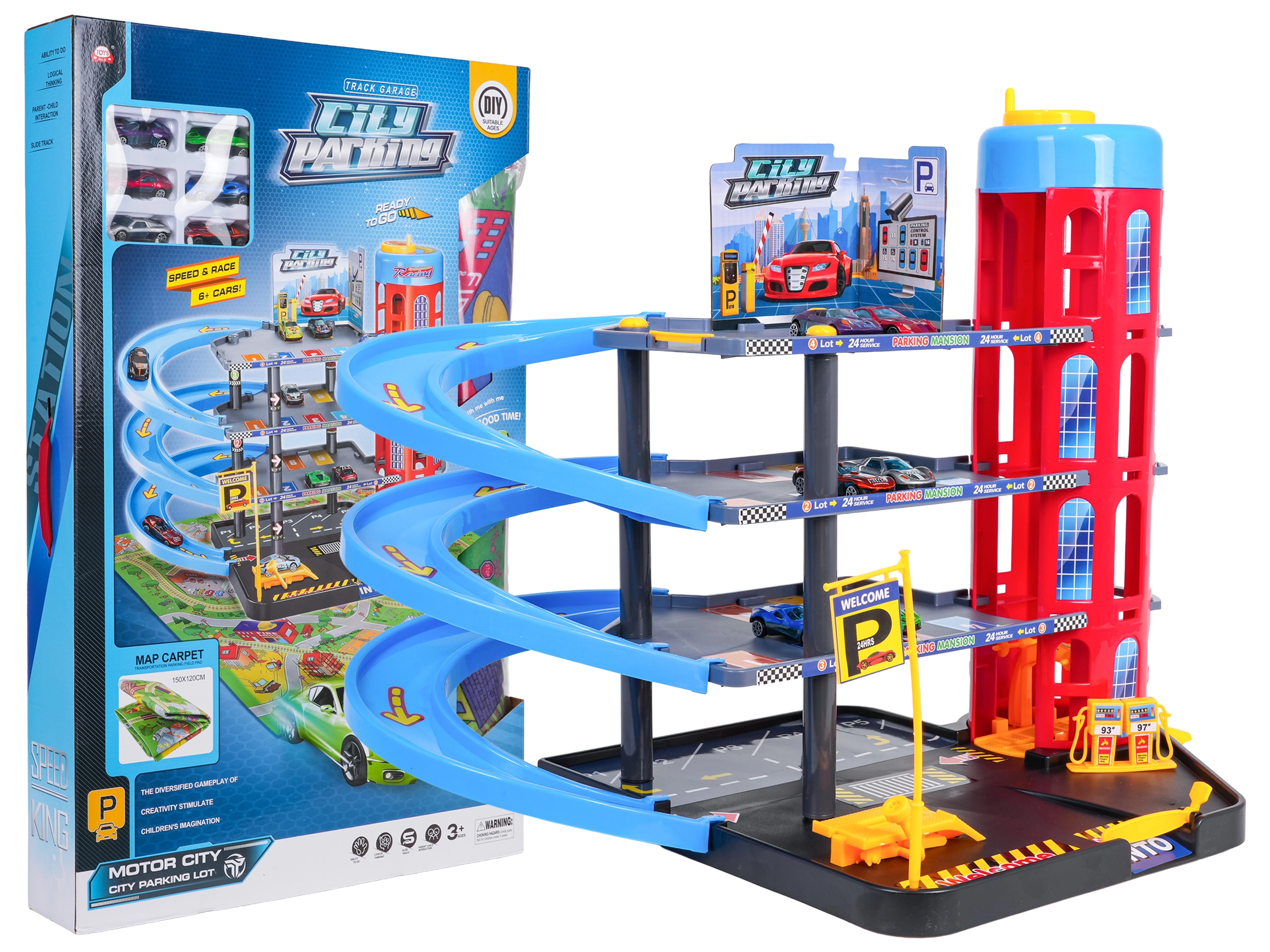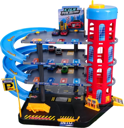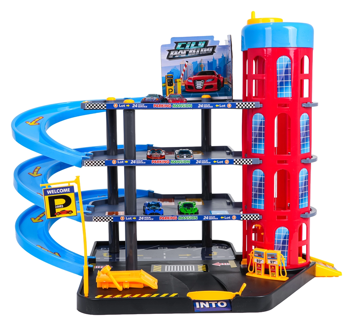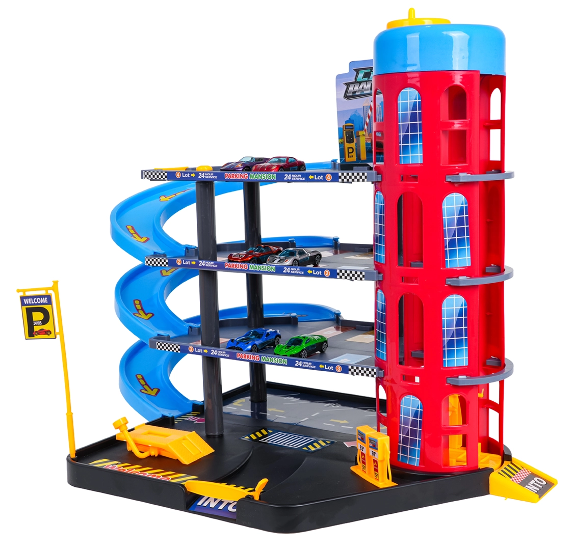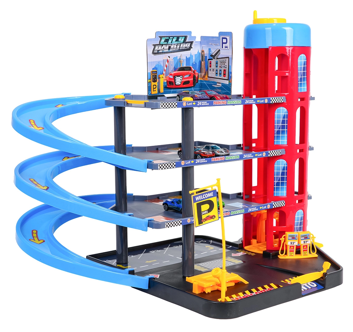 Este colorido aparcamiento de varios niveles combina elementos urbanos realistas con conducción dinámica. Los niños pueden subir los coches con el ascensor de accionamiento manual, aparcarlos en diferentes pisos y soltarlos por las rampas en espiral. La gasolinera, el elevador de servicio y la barrera de entrada integradas fomentan el juego imaginativo.
