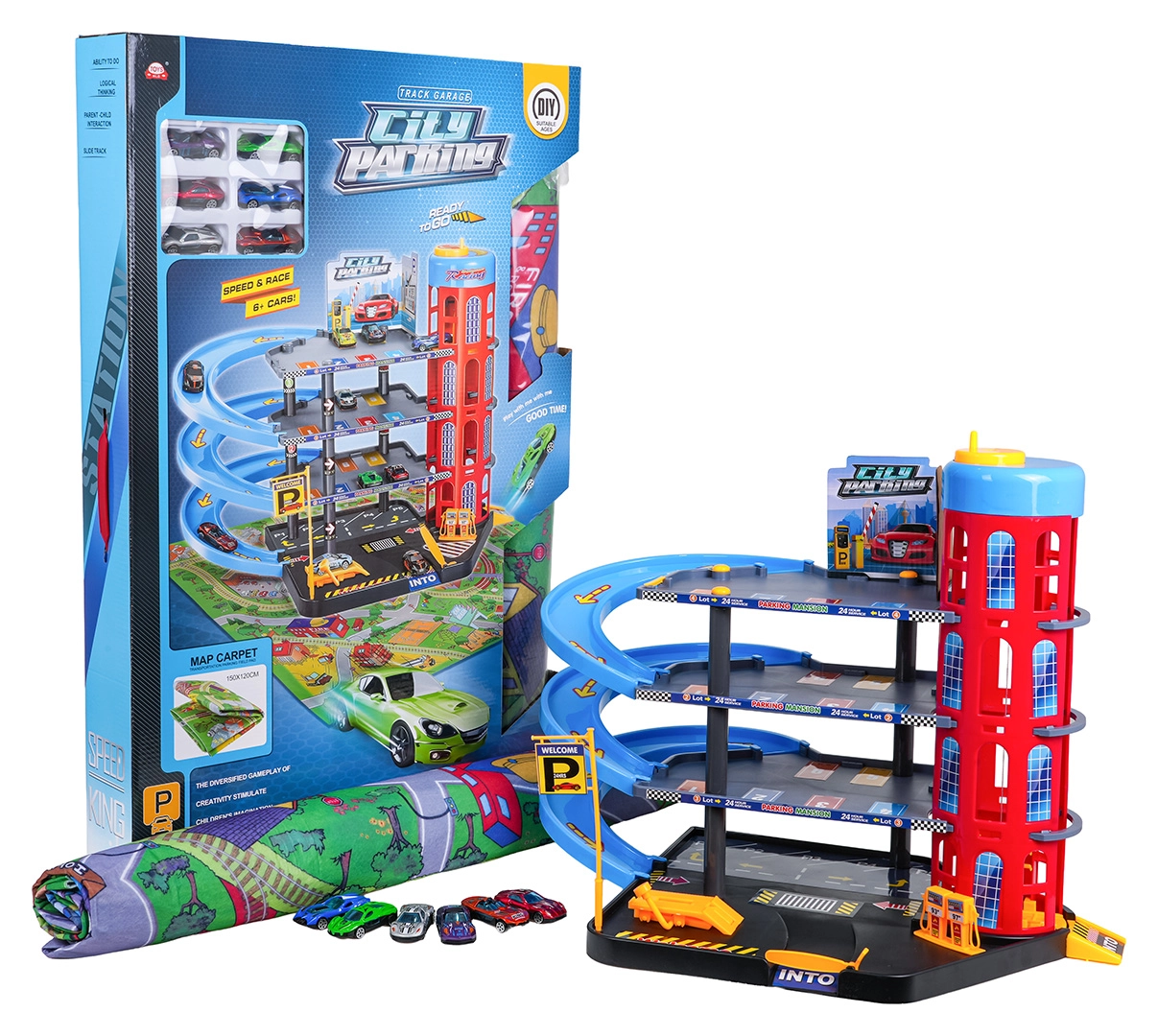 El set incluye un gran tapete de fieltro con calles que amplía el área de juego y 6 cochecitos robustos con carrocería metálica para competir de inmediato. Su construcción duradera y los detalles bien pensados hacen de este aparcamiento un set ideal para el juego diario.