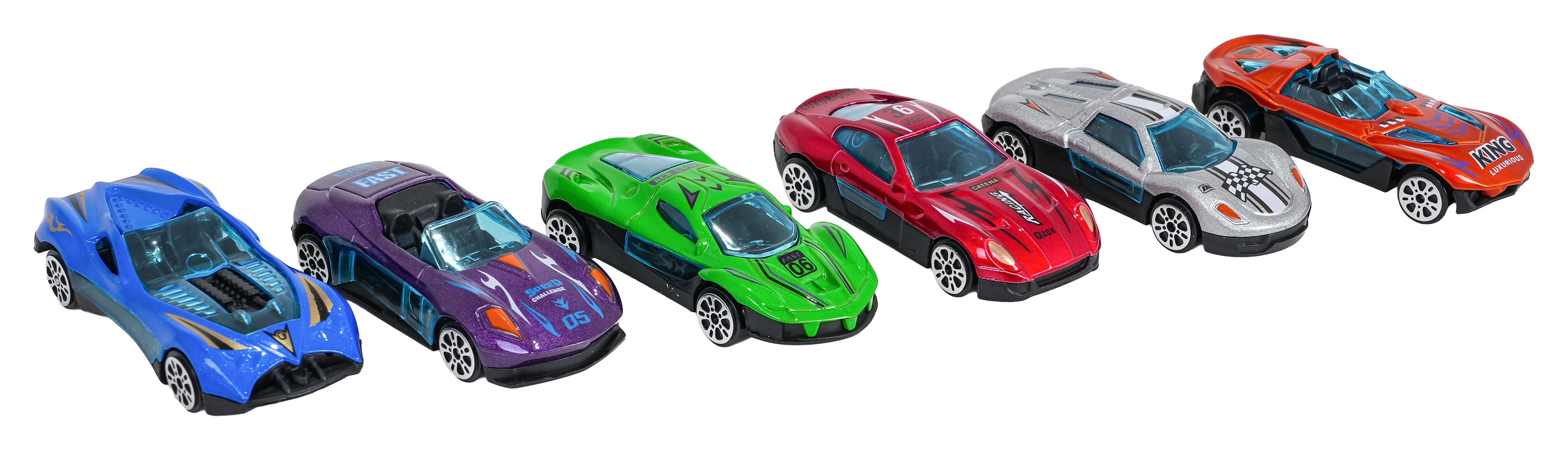 Listo para jugar al instante: seis coches resistentes con carrocería metálica, ruedas de rodaje suave y gráficos deportivos para carreras sin fin.