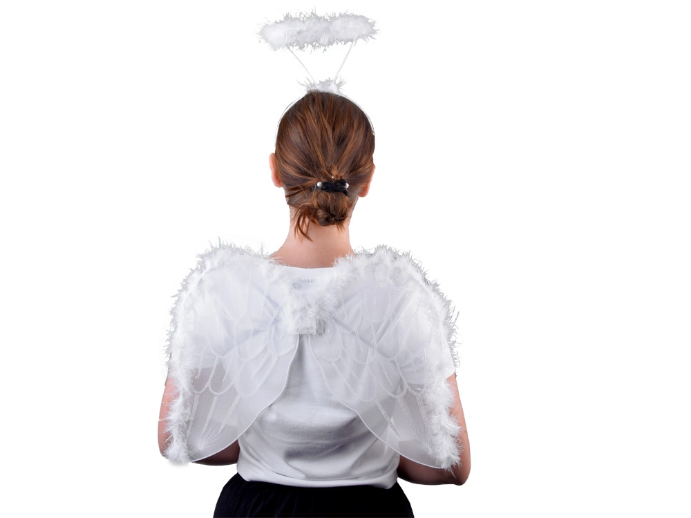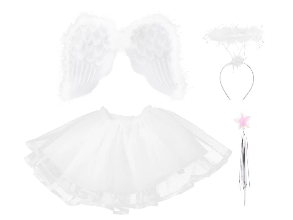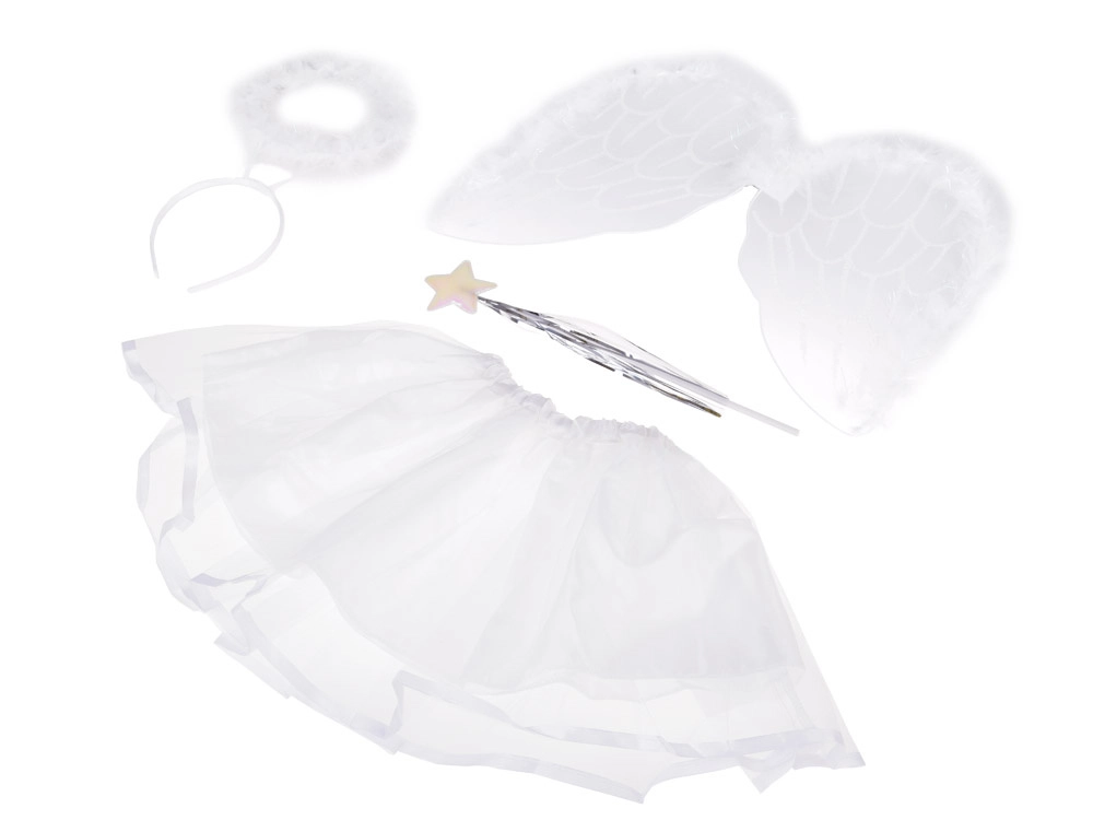 - Alas, aureola en diadema, falda tutu, varita mágica