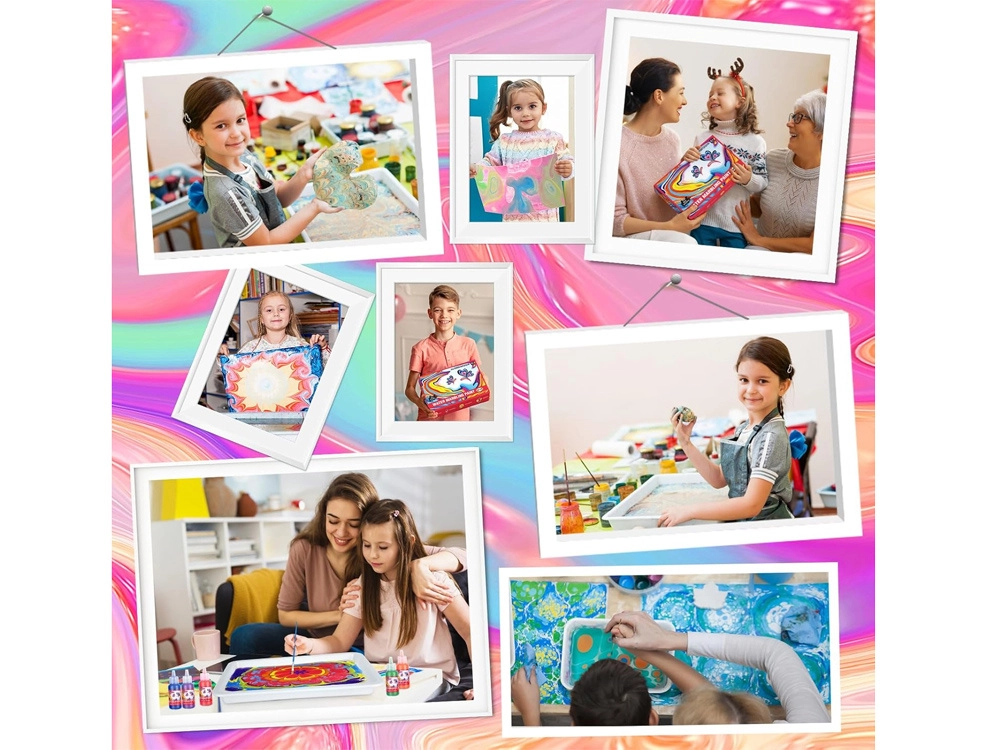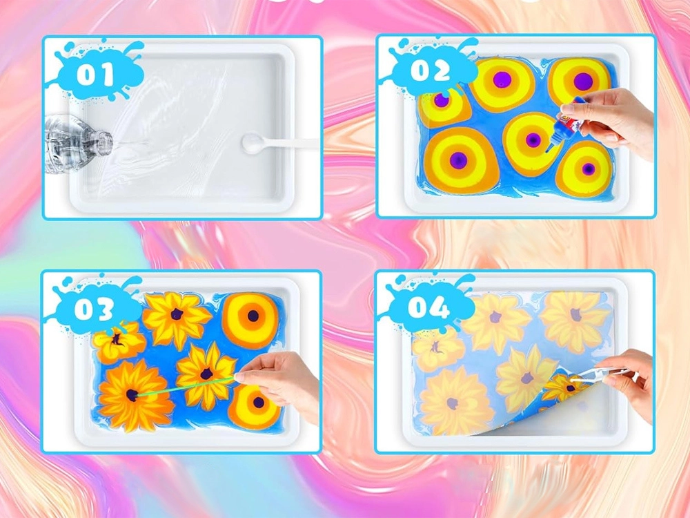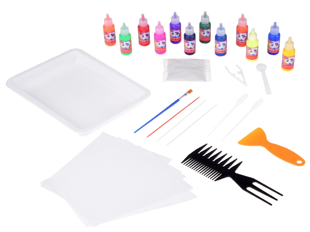 En el paquete encontrarás todo lo necesario: 12 frascos de pintura (16 ml) con punta precisa, bandeja de plástico, papeles y un conjunto de herramientas (cuentagotas, peine, pincel, espátula, etc.). Tras mezclar el polvo con agua crearás un baño gelatinoso en el que gotear los colores y modelar el patrón, que luego se transfiere fácilmente al papel.