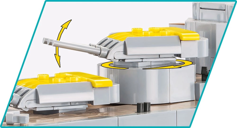 El barco ofrece numerosos detalles funcionales: torretas giratorias con elevación de cañones, hélices y timones móviles, cubierta y superestructuras realistas. En la caja se incluye un elegante soporte negro y una placa blanca con el nombre del buque. Un manual intuitivo con iconos claros facilita el montaje incluso a constructores menos experimentados.