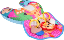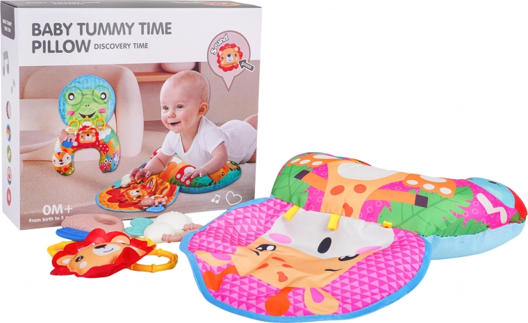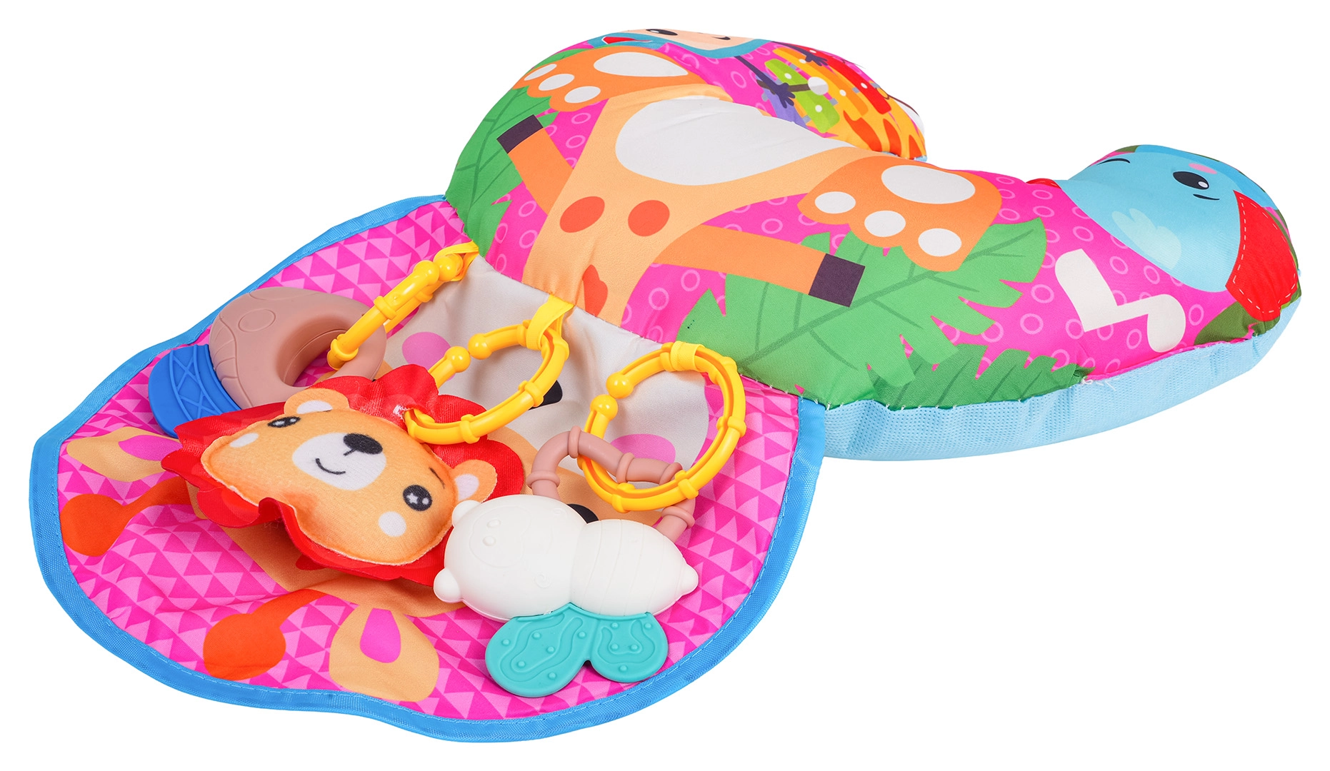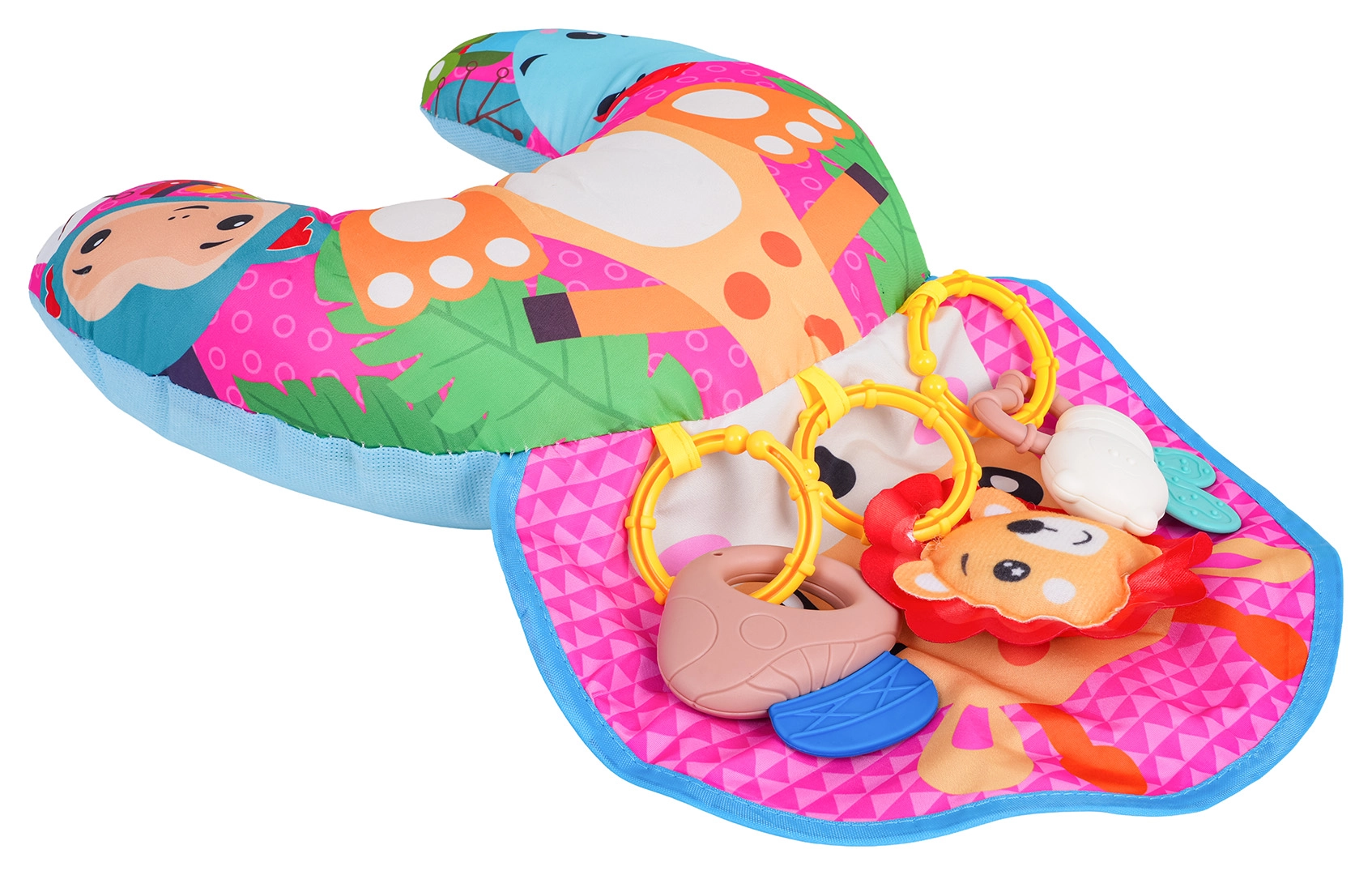 Suave y colorido cojín para bebés en forma de U con motivo de jirafa que sostiene al bebé durante el tiempo boca abajo y al sentarse. Incluye juguetes colgantes desmontables con mordedores, sonajero y pito, que desarrollan los sentidos y la motricidad. Apto desde los primeros días de vida, fabricado con materiales seguros.
