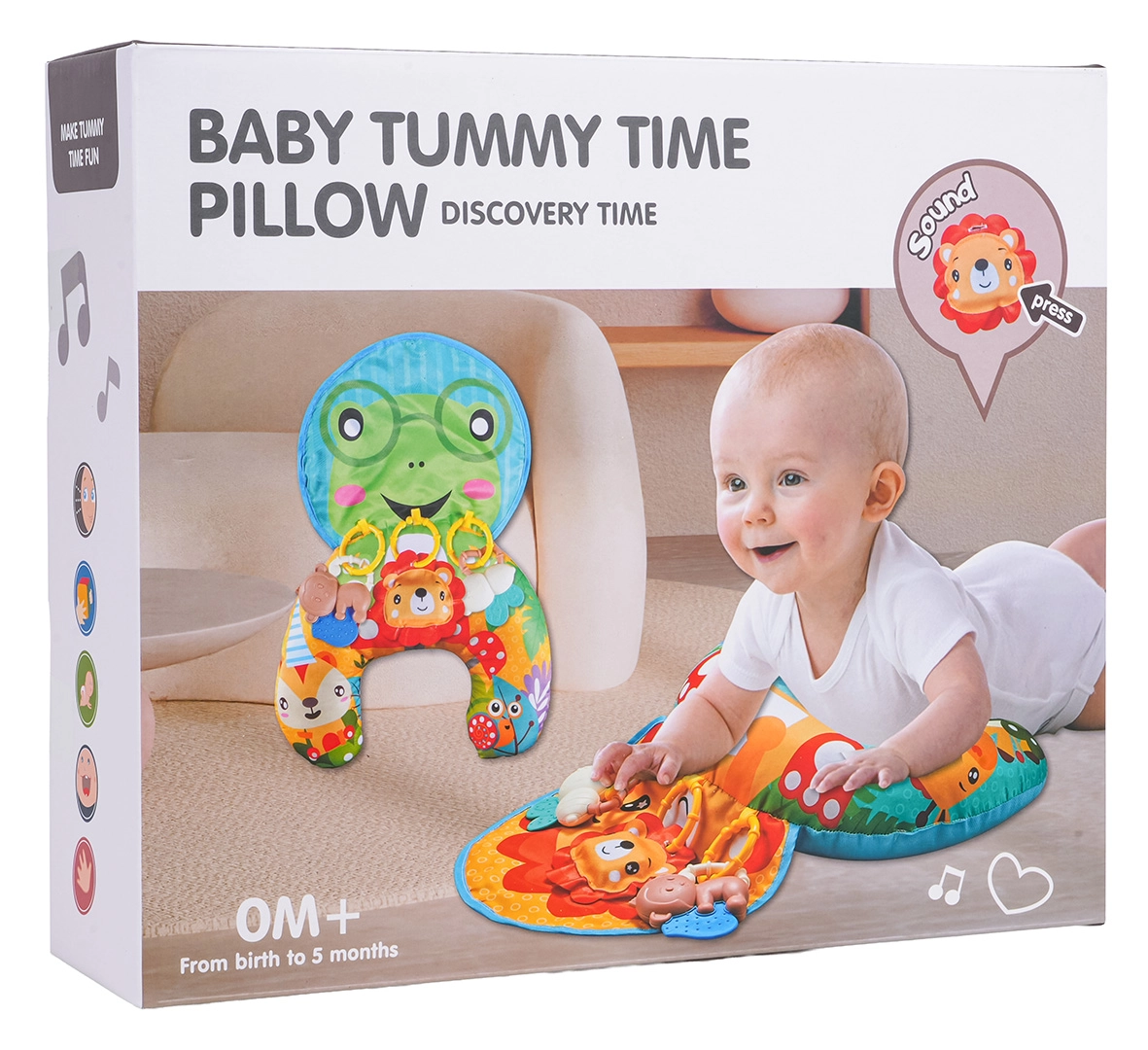 Este cojín sensorial multifuncional para los más pequeños es ideal para el juego diario y el descanso. Durante el tiempo boca abajo proporciona un soporte estable que ayuda a fortalecer los músculos del cuello y la espalda. Para los niños que ya se sientan, sirve como base acolchada y más tarde como cómodo apoyo en la silla de auto o el cochecito.