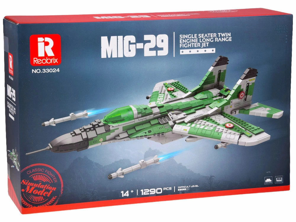 Este modelo detallado del MIG‑29, con esquema de camuflaje militar gris‑verde, reproduce fielmente sus alas características, dobles estabilizadores verticales y entradas de aire realistas de su configuración bimotor. Gracias a sus impresionantes dimensiones, es una pieza llamativa para la estantería y un set atractivo para constructores más exigentes a partir de 14 años.
