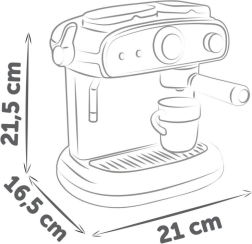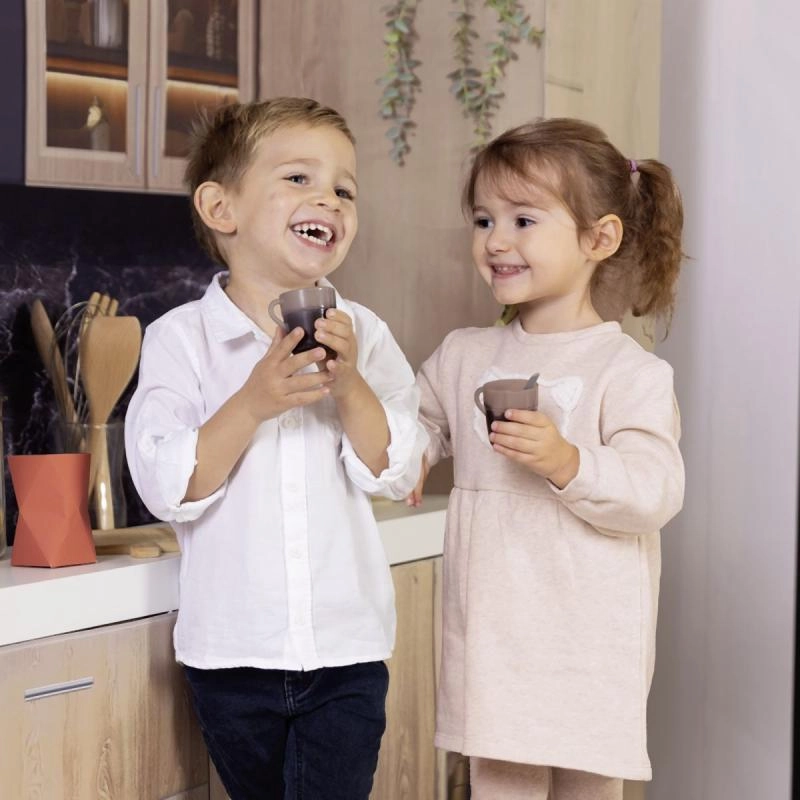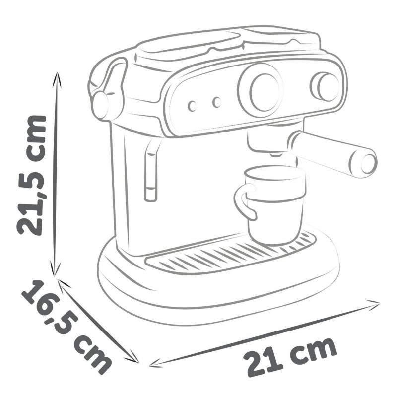El práctico set incluye 2 tazas, 2 cucharitas y 2 cápsulas de café, para que los niños puedan atender también a amigos o hermanos. Sus dimensiones compactas de 16,5 × 21 × 21,5 cm garantizan que la cafetera encaje en cualquier encimera de cocina infantil.