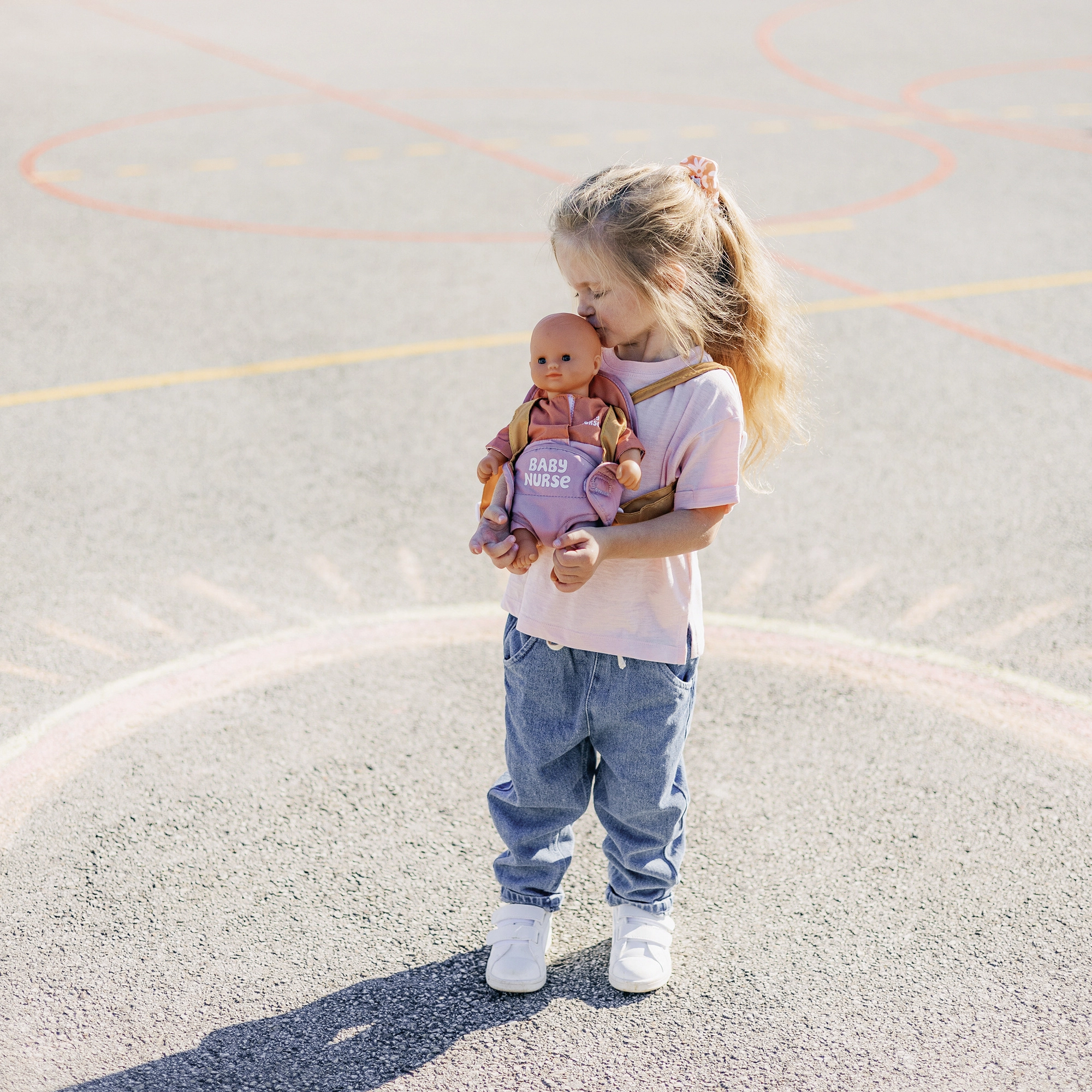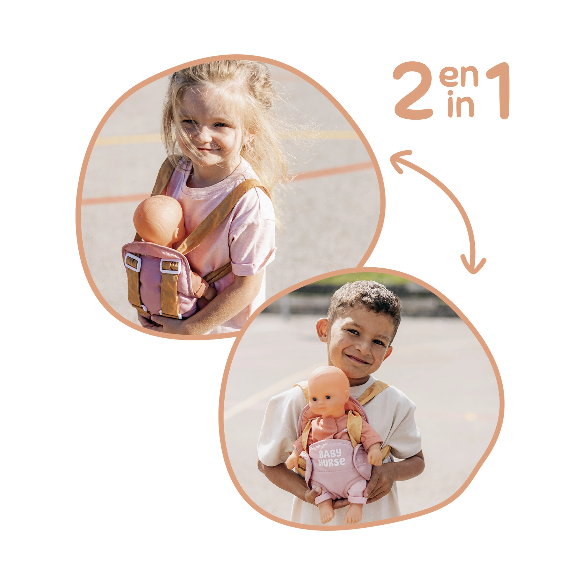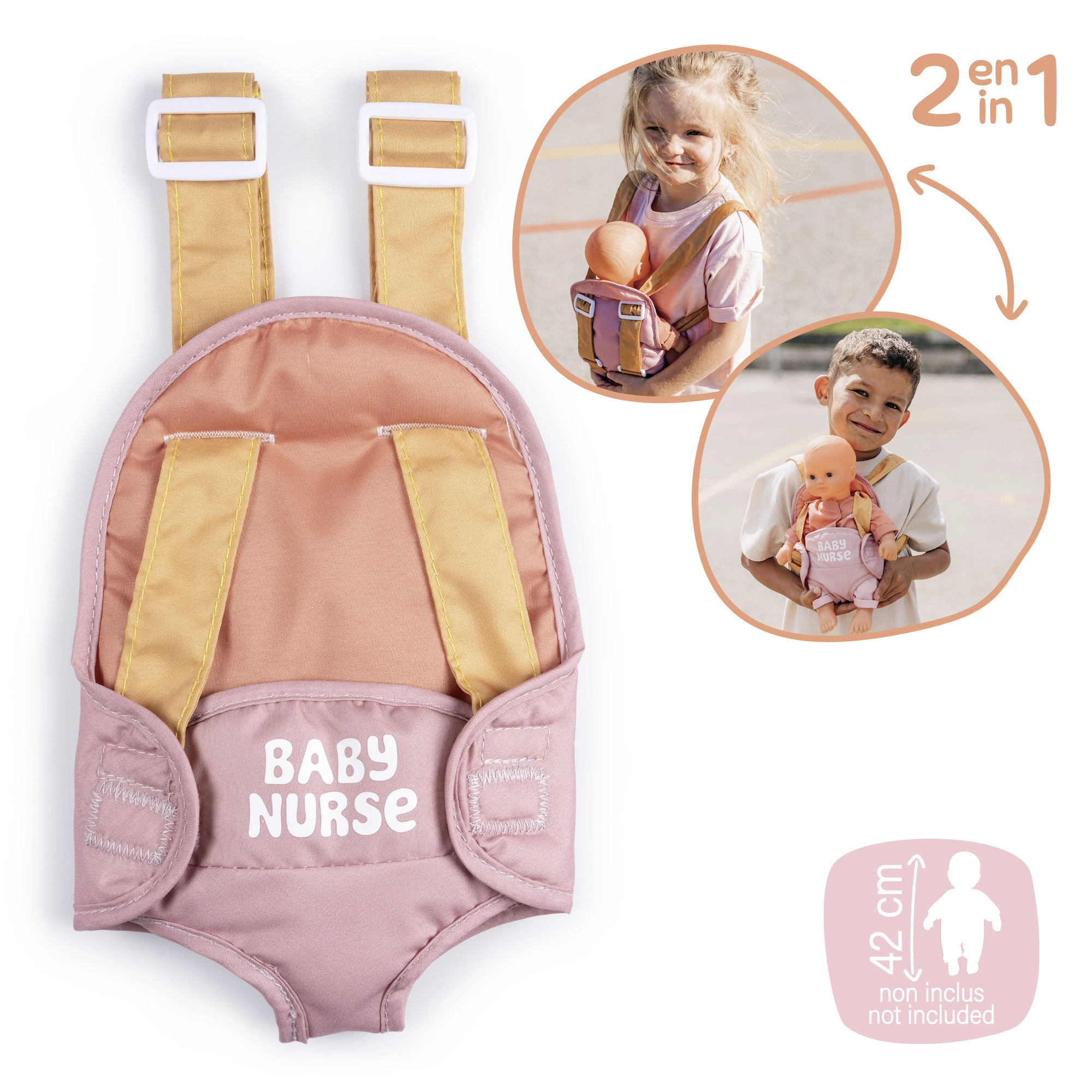 El portabebés se ajusta fácilmente a la complexión del niño gracias a los tirantes ajustables. La combinación pastel de rosa y ocre resulta delicada y moderna, por lo que complementa perfectamente el equipo para muñecas BABY NURSE.