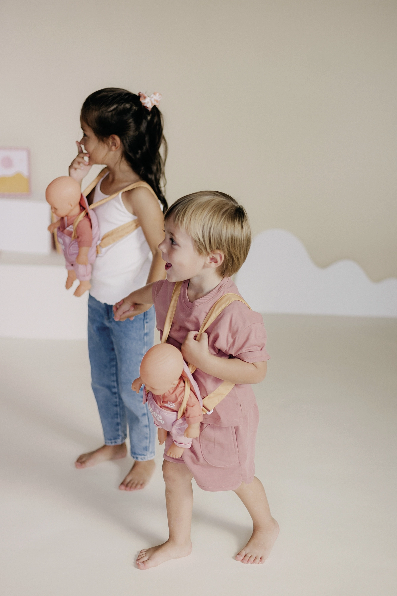 El portabebés, ligero y suave, permite a los niños imitar a los adultos y desarrollar la empatía y la motricidad fina en escenas cotidianas.