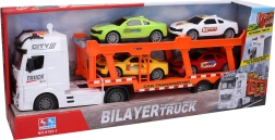 Haz felices a los pequeños amantes de los coches con este robusto camión remolcador a fricción de impresionantes 56 cm. El set incluye cuatro coches individuales (16 cm) con ruedas libres y ofrece auténticos efectos de luz y sonido, desde el arranque del motor hasta la marcha atrás y el sonido del movimiento de la plataforma.