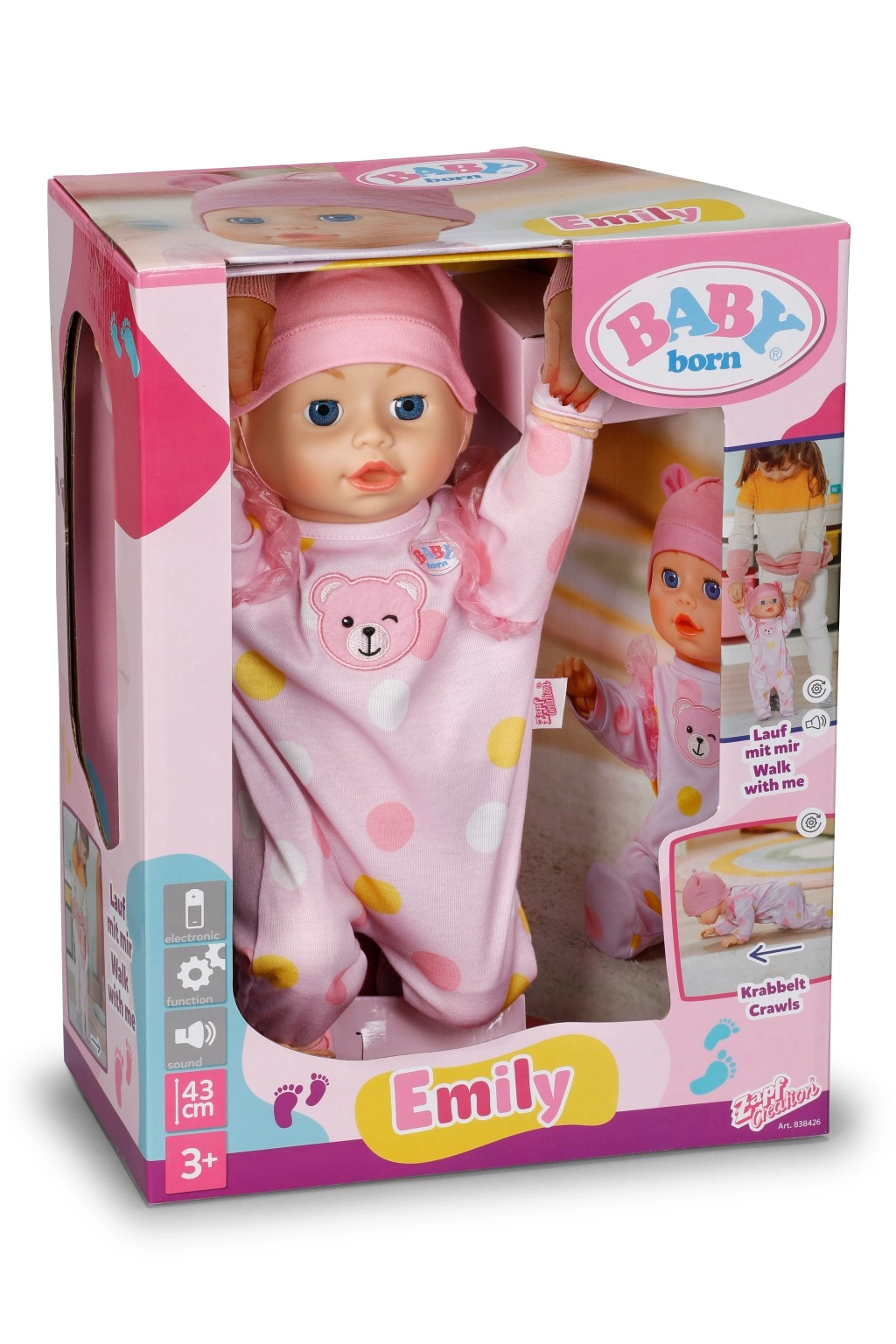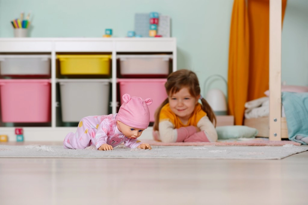 La muñeca BABY born Emily motiva a los niños al movimiento y la creatividad: un mecanismo sencillo y seguro permite que la muñeca eche a andar o gatee por el suelo. Así, los niños pueden imitar el cuidado del bebé, inventar historias y, al mismo tiempo, desarrollar la motricidad fina y gruesa.